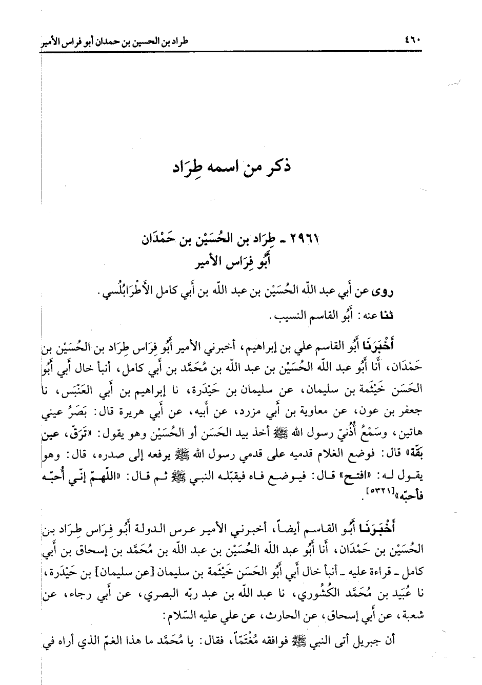 2961 - طراد بن الحسين بن حمدان أبو فراس الأمير روى عن أبي عبد الله الحسين بن عبد الله بن أبي كامل الأطرابلسي ثنا عنه أبو القاسم النسيب أخبرنا أبو القاسم علي بن إبراهيم أخبرني الأمير أبو فراس طراد بن الحسين بن حمدان أنا أبو عبد الله الحسين بن عبد الله بن محمد بن أبي كامل أنبأ خال أبي أبو الحسن خيثمة بن سليمان عن سليمان بن حيدرة نا إبراهيم بن أبي العنبس نا جعفر بن عون عن معاوية بن أبي مزرد عن أبيه عن أبي هريرة قال بصر عيني هاتين وسمع أذني رسول الله (صلى الله عليه وسلم) أخذ بيد الحسن أو الحسين وهو يقول ترق عين بقة قال فوضع الغلام قدميه على قدمي رسول الله (صلى الله عليه وسلم) يرفعه إلى صدره قال وهو يقول له افتح قال فيوضع فاه فيقبله النبي (صلى الله عليه وسلم) ثم قال اللهم إني أحبه فأحبه أخبرنا أبو القاسم أيضا أخبرني الأمير عرس الدولة أبو فراس طراد بن الحسين بن حمدان أنا أبو عبد الله الحسين بن عبد الله بن محمد بن إسحاق بن أبي كامل قراءة عليه أنبأ خال أبي أبو الحسن خيثمة بن سليمان عن سليمان بن حيدرة نا عبيد بن محمد الكشوري نا عبد الله بن عبد ربه البصري عن أبي رجاء عن شعبة عن أبي إسحاق عن الحارث عن علي عليه السلام أن جبريل أتى النبي (صلى الله عليه وسلم) فوافقه مغتما فقال يا محمد ما هذا الغم الذي أراه في