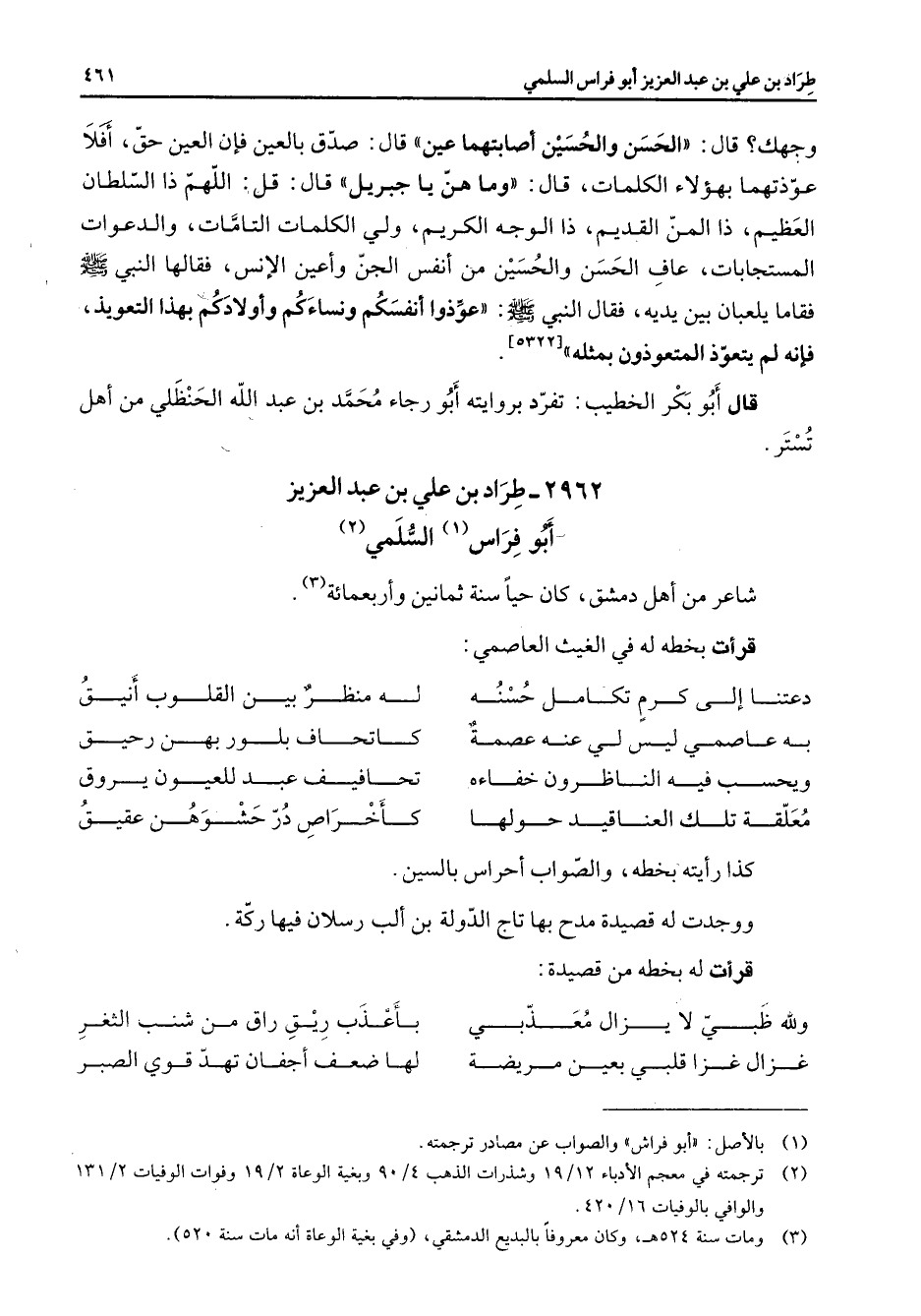 2962 - طراد بن علي بن عبد العزيز أبو (1) فراس السلمي (2) شاعر من أهل دمشق كان حيا سنة ثمانين وأربعمائة (3)