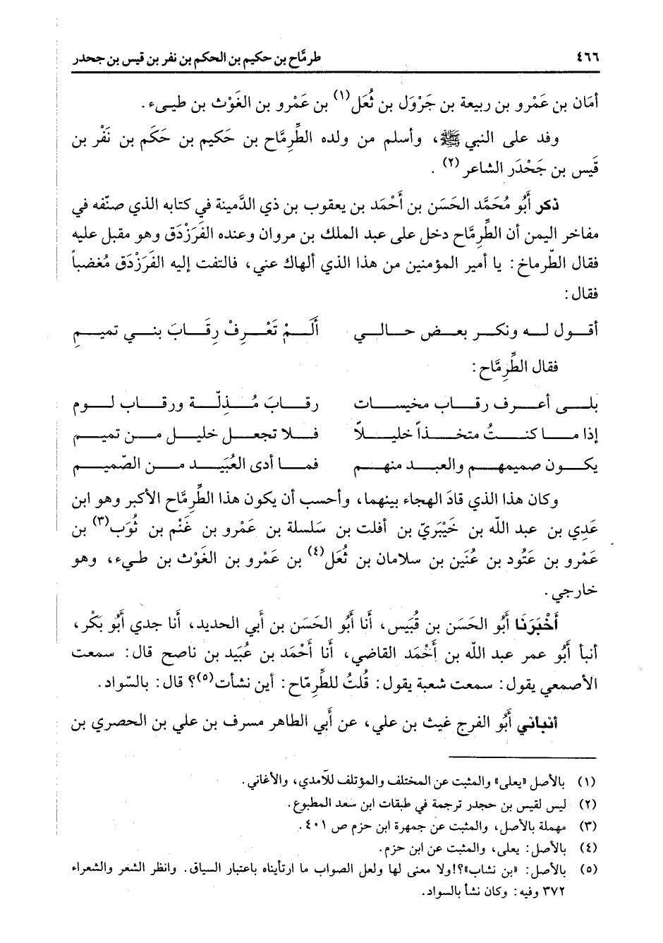 ذكر أبو محمد الحسن بن أحمد بن يعقوب بن ذي الدمينة في كتابه الذي صنفه في مفاخر اليمن أن الطرماح دخل على عبد الملك بن مروان وعنده الفرزدق وهو مقبل عليه فقال الطرماح يا أمير المؤمنين من هذا الذي ألهاك عني فالتفت إليه الفرزدق مغضبا فقال: * أقول له ونكر بعض حالي * ألم تعرف رقاب بني تميم * فقال الطرماح: * بلى أعرف رقاب مخيسات * رقاب مذلة ورقاب لوم إذا ما كنت متخذا خليلا * فلا تجعل خليل من تميم يكون صميمهم والعبد منهم * فما أدى العبيد من الصميم * وكان هذا الذي قاد الهجاء بينهما وأحسب أن يكون هذا الطرماح الأكبر وهو ابن عدي بن عبد الله بن خيبري بن أفلت بن سلسلة بن عمرو بن غنم بن ثوب (3) بن عمرو بن عتود بن عنين بن سلامان بن ثعل بن عمرو بن الغوث بن طئ وهو خارجي أخبرنا أبو الحسن بن قبيس أنا أبو الحسن بن أبي الحديد أنا جدي أبو بكر أنبأ أبو عمر عبد الله بن أحمد القاضي أنا أحمد بن عبيد بن ناصح قال سمعت الأصمعي يقول سمعت شعبة يقول قلت للطرماح أين نشأت (5) قال بالسواد أنبأني أبو الفرج غيث بن علي عن أبي الطاهر مسرف بن علي بن الحصري بن
