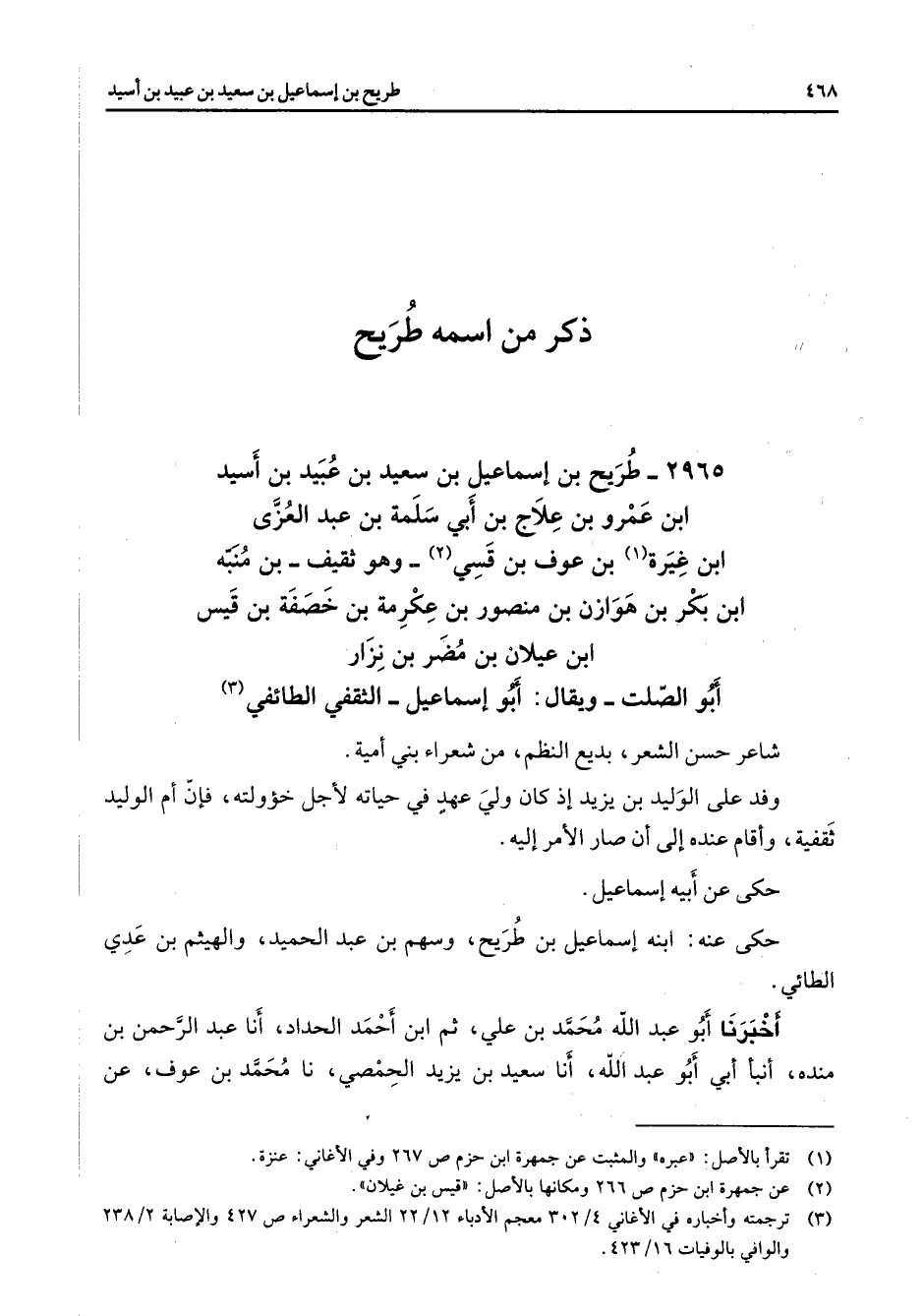 2965 - طريح بن إسماعيل بن سعيد بن عبيد بن أسيد ابن عمرو بن علاج بن أبي سلمة بن عبد العزى ابن غيرة (1) بن عوف بن قسي (2) وهو ثقيف بن منبه ابن بكر بن هوزان بن منصور بن عكرمة بن خصفة بن قيس ابن عيلان بن مضر بن نزار أبو الصلت ويقال أبو إسماعيل الثقفي الطائفي (3) شاعر حسن الشعر بديع النظم من شعراء بني أمية وفد على الوليد بن يزيد إذ كان ولي عهد في حياته لأجل خؤولته فإن أم الوليد ثقفيه وأقام عنده إلى أن صار الأمر إليه حكى عن أبيه إسماعيل حكى عنه ابنه إسماعيل بن طريح وسهم بن عبد الحميد والهيثم بن عدي الطائي أخبرنا أبو عبد الله محمد بن علي ثم ابن أحمد الحداد أنا عبد الرحمن بن منده أنبأ أبي أبو عبد الله أنا سعيد بن يزيد الحمصي نا محمد بن عوف عن