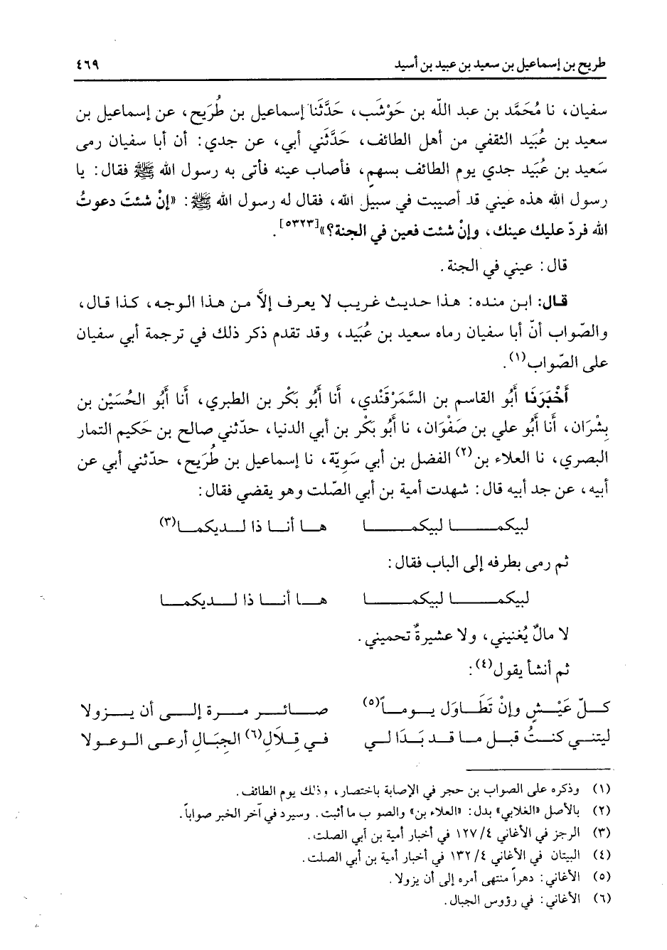 سفيان نا محمد بن عبد الله بن حوشب حدثنا إسماعيل بن طريح عن إسماعيل بن سعيد بن عبيد الثقفي من أهل الطائف حدثني أبي عن جدي أن أبا سفيان رمى سعيد بن عبيد جدي يوم الطائف بسهم فأصاب عينه فأتى به رسول الله (صلى الله عليه وسلم) فقال يا رسول الله هذه عيني قد أصيبت في سبيل الله فقال له رسول الله (صلى الله عليه وسلم) إن شئت دعوت الله فرد عليك عينك وإن شئت فعين في الجنة قال عيني في الجنة قال ابن منده هذا حديث غريب لا يعرف إلا من هذا الوجه كذا قال والصواب أن أبا سفيان رماه سعيد بن عبيد وقد تقدم ذكر ذلك في ترجمة أبي سفيان على الصواب (1)