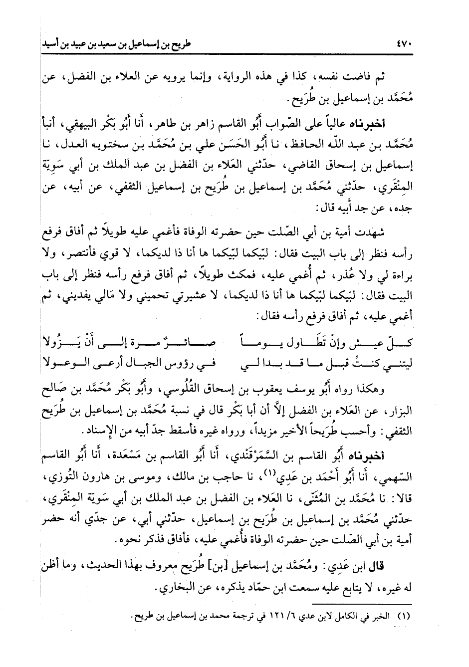 (1) الخبر في الكامل لابن عدي 6 / 121 في ترجمة محمد بن إسماعيل بن طريح