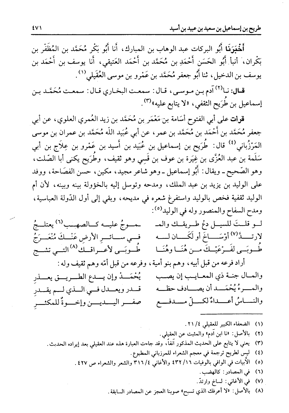 قرأت على أبي الفتوح أسامة بن معمر بن محمد بن زيد العمري العلوي عن أبي جعفر محمد بن أحمد بن محمد بن عمر عن أبي عبيد الله محمد بن عمران بن موسى المرزباني (4) قال طريح بن إسماعيل بن عبيد بن أسيد بن عمرو بن علاج بن أبي سلمة بن عبد العزى بن غيرة بن عوف بن قسي وهو ثقيف وطريح يكنى أبا الصلت وهو الصحيح ويقال أبو إسماعيل وهو شاعر مجيد مكين حسن الفصاحة ووفد على الوليد بن يزيد بن عبد الملك ومدحه وتوسل إليه بالخؤولة بينه وبينه لأن أم الوليد ثقفية فخص بالوليد واستفرغ شعره في مديحه وبقي إلى أول الدولة العباسية ومدح السفاح والمنصور وله في الوليد (5) : * لو قلت للسيل دع طريقك والم * موج عليه كالصهب (6) يعتلج لارتد (7) أوساخ أو لكان له * في سائر الأرض عنك منعرج طوبى لفرعيك من هنا وهنا * طوبى لأعراقك التي (8) تشج * أراد فرعه من قبل أبيه وهم بنو أمية وفرعه من قبل أمه وهم ثقيف وله: * والمال جنة ذي المعايب أن يصب * يحمد وإن يدع الطريق يعذر والمرء يحمد أن يصادف حظه * قدر ويعدل في الذي لم يقدر والناس أعداء لكل مدفع * صفر اليدين وإخوة للمكثر
