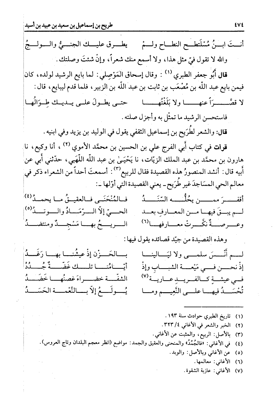 * أنت ابن مسلتطح النطاح ولم * يطرق عليك الجني والولج * والله لا تقول في مثل هذا ولا أسمع منك شعرا وإن شئت وصلتك قال أبو جعفر الطبري (1) : وقال إسحاق الموصلي لما بايع الرشيد لولده كان فيمن بايع عبد الله بن مصعب بن ثابت بن عبد الله بن الزبير فلما قدم ليبايع قال: * لا قصرا عنها ولا بلغتها * حتى يطول على يديك طوالها * فاستحسن الرشيد ما تمثل به وأجزل صلته قال والشعر لطريح بن إسماعيل الثقفي يقول في الوليد بن يزيد وفي ابنيه قرأت في كتاب أبي الفرج على بن الحسين بن محمد الأموي (2) أنا وكيع نا هارون بن محمد بن عبد الملك الزيات نا يحيى بن عبد الله اللهبي حدثني أبي عن أبيه قال أنشد المنصور هذه القصيدة فقال للربيع (3) أسمعت أحدا من الشعراء ذكر في معالم الحي المساجد غير طريح يعني القصيدة التي أولها: * أقفر ممن يحله السند * فالمنحني فالعقيق ما يحمد (4) لم يبق فيها من المعارف بعد * الحي إلا الرماد والوتد (5) وعرصة نكرت معارفها (6) * الريح بها مسجد ومنتضد * وهذه القصيدة من جيد قصائده يقول فيها: * لم أنس سلمى لا ليالينا * بالحزن إذ عيشنا بها رغد إذ نحن في ميعة الشباب وإذ * أيامنا تلك غضة جدد في عيشة كالفريد عارية (7) * الشفة خضراء غصنها خضد تحسد فيها على النعيم وما * يولع إلا بالنعمة الحسد