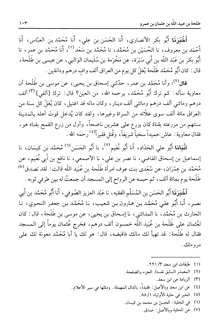 أخبرنا أبو بكر الأنصاري أنا الحسن بن علي أنا محمد بن العباس أنا أحمد بن معروف نا الحسين بن محمد نا محمد بن سعد (1) أنا محمد بن عمر نا أبو بكر بن عبد الله بن أبي سبرة عن مخرمة بن سليمان الوالبي عن عيسى بن طلحة قال كان أبو محمد طلحة يغل كل يوم من العراق ألف واف درهم ودانقين قال (2) وأنا محمد بن عمر حدثني إسحاق بن يحيى عن موسى بن طلحة أن معاوية سأله كم ترك أبو محمد يرحمه الله من العين قال ترك ألفي (3) ألف درهم ومائتي ألف دينار وكان ماله قد اغتيل كان يغل كل سنة من العراق مائة ألف سوى غلاته من السراة وغيرها ولقد كان يدخل قوت أهله بالمدينة سنتهم من مزرعته بقناة كان يزرع على عشرين ناضحا وأول من زرع القمح بقناة هو فقال معاوية عاش حميدا سخيا شريفا وقتل فقيرا (4) رحمه الله أنبأنا أبو علي الحداد أنا أبو نعيم نا أبو الحسن (6) محمد بن كيسان نا إسماعيل بن إسحاق القاضي نا نصر بن علي نا الأصمعي نا نافع بن أبي نعيم عن محمد بن عمران عن سعدى بنت عوف امرأة طلحة بن عبيد الله قالت لقد تصدق (7) طلحة يوم بمائة ألف ثم حبسه عن الرواح إلى المسجد أن جمعت له بين طرفي ثوبه أخبرنا أبو الحسن بن المسلم الفقيه نا عبد العزيز الصوفي أنا أبو محمد بن أبي نصر أنا أبو علي محمد بن هارون بن شعيب نا محمد بن جعفر النحوي نا الحارث بن محمد نا المدائني نا إسحاق بن يحيى عن موسى بن طلحة قال كان لعثمان على طلحة بن عبيد الله خمسون ألف درهم فخرج عثمان يوما إلى المسجد فقال له طلحة قد تهيأ لك مالك فاقبضه قال هو لك يا أبا محمد معونة لك على مروءتك