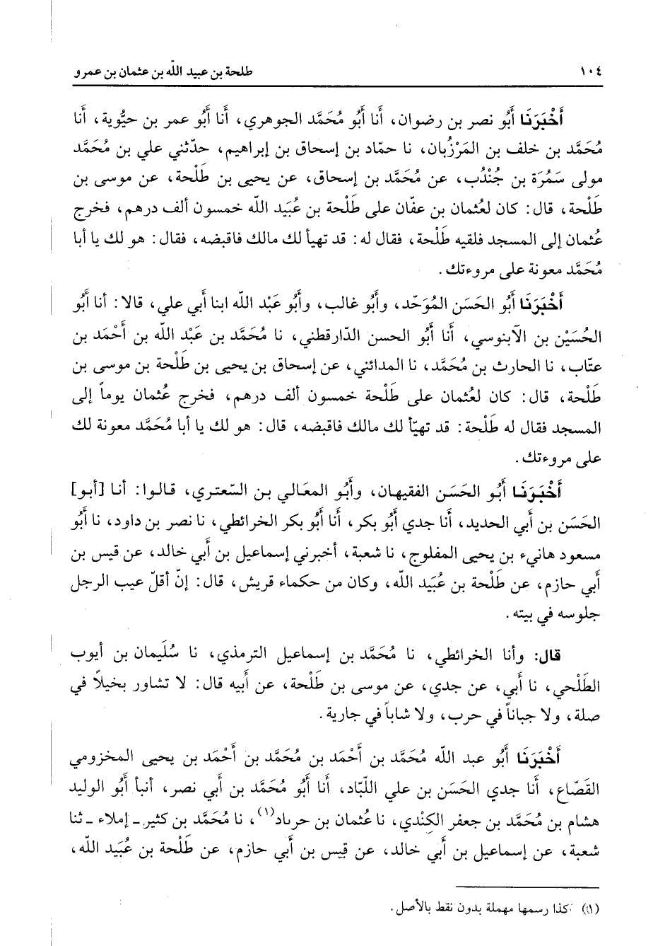 أخبرنا أبو نصر بن رضوان نا أبو محمد الجوهري أنا أبو عمر بن حيوية أنا محمد بن خلف بن المرزبان نا حماد بن إسحاق بن إبراهيم حدثني علي بن محمد مولى سمرة بن جندب عن محمد بن إسحاق عن يحيى بن طلحة عن موسى بن طلحة قال كان لعثمان بن عفان على طلحة بن عبيد الله خمسون ألف درهم فخرج عثمان إلى المسجد فلقيه طلحة فقال له قد تهيأ لك مالك فاقبضه فقال هو لك يا أبا محمد معونة على مروءتك أخبرنا أبو الحسن الموحد وأبو غالب وأبو عبد الله ابنا أبي علي قالا أنا أبو الحسين بن الآبنوسي أنا أبو الحسن الدارقطني نا محمد بن عبد الله بن أحمد بن عتاب نا الحارث بن محمد نا المدائني عن إسحاق بن يحيى بن طلحة بن موسى بن طلحة قال كان لعثمان على طلحة خمسون ألف درهم فخرج عثمان يوما إلى المسجد فقال له طلحة قد تهيأ لك مالك فاقبضه قال هو لك يا أبا محمد معونة لك على مروءتك أخبرنا أبو الحسن الفقيهان وأبو المعالي بن السعتري قالوا أنا أبو الحسن بن أبي الحديد أنا جدي أبو بكر انا أبو بكر الخرائطي نا نصر بن داود نا أبو مسعود هانئ بن يحيى المفلوج نا شعبة أخبرني إسماعيل بن أبي خالد عن قيس بن أبي حازم عن طلحة بن عبيد الله وكان من حكماء قريش قال إن أقل عيب الرجل جلوسه في بيته قال وأنا الخرائطي نا محمد بن إسماعيل الترمذي نا سليمان بن أيوب الطلحي نا أبي عن جدي عن موسى بن طلحة عن أبيه قال لا تشاور بخيلا في صلة ولا جبانا في حرب ولا شابا في جارية أخبرنا أبو عبد الله محمد بن أحمد بن محمد بن أحمد بن يحيى المخزومي القصاع أنا جدي الحسن بن علي اللباد أنا أبو محمد بن أبي نصر أنبأ أبو الوليد هشام بن محمد بن جعفر الكندي نا عثمان بن حرباء نا محمد بن كثير إملاء ثنا شعبة عن إسماعيل بن أبي خالد عن قيس بن أبي حازم عن طلحة بن عبيد الله