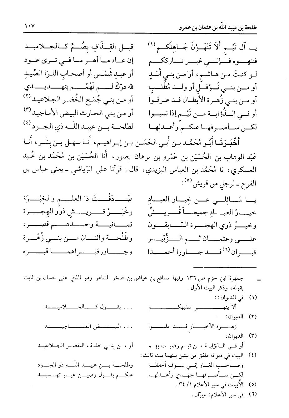 يا آل تيم ألا تنهون جاهلكم (1) قبل القذاف بصم كالجلاميد فتنهوه فإني غير تارككم * إن عاد ما أهر ما في ترى عود لو كنت من هاشم أو من بني أسد * أو عبد شمس أو أصحاب اللوا الصيد أو من بني نوفل أو ولد مطلب * لله درك لم تهمم بتهديدي أو من بني زهرة الأبطال قد عرفوا * أو من بني جمع الخضر الجلاعيد (2) أو في الذؤابة من تيم إذا نسبوا * أو من بني الحارث البيض الأماجيد (3) لكن سأصرفها عنكم وأعدلها * لطلحة بن عبيد الله ذي الجود (4) أخبرنا أبو محمد بن أبي الحسن بن إبراهيم أنا سهل بن بشر أنا عبد الوهاب بن الحسين بن عمرو بن برهان بصور أنا الحسين بن محمد بن عبيد العسكري نا محمد بن العباس اليزيدي قال قرأنا على الرياشي يعني عباس بن الفرح لرجل من قريش (5) يا سائلي عن خيار العباد * صادفت ذا العلم والخبرة خيار العباد جميعا قريش * وخير قريش ذوو الهجرة وخير ذوي الهجرة السابقون * ثمانية وحدهم قصره علي وعثمان ثم الزبير * وطلحة واثنان من بني زهرة قبران (6) قد جاورا أحمدا * وجاور قبراهما قبره