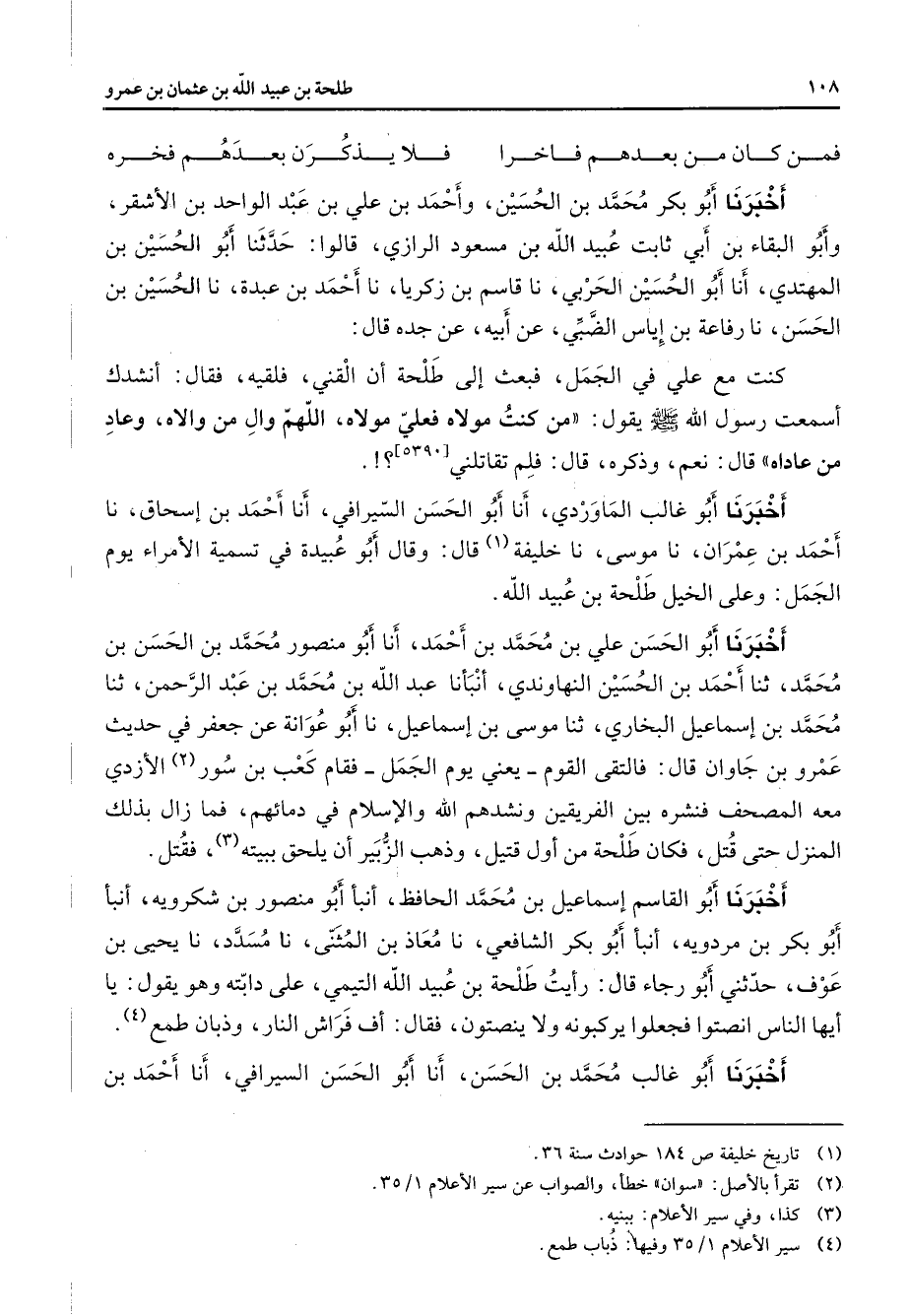 فمن كان من بعدهم فاخرا * فلا يذكرن بعدهم فخره أخبرنا أبو بكر محمد بن الحسين وأحمد بن علي بن عبد الواحد بن الأشقر وأبو البقاء أبن أبي ثابت عبيد الله بن مسعود الرازي قالوا حدثنا أبو الحسين بن المهتدي أنا أبو الحسين الحربي نا قاسم بن زكريا نا أحمد بن عبدة نا الحسين بن الحسن نا رفاعة أبن إياس الضبي عن أبيه عن جده قال كنت مع علي في الجمل فبعث إلى طلحة أن القني فلقيه فقال أنشدك أسمعت رسول الله (صلى الله عليه وسلم) يقول من كنت مولاه فعلي مولاه اللهم وال من والاه وعاد من عاداه قال نعم وذكره قال فلم تقاتلني أخبرنا أبو غالب الماوردي أنا أبو الحسن السيرافي أنا أحمد بن إسحاق نا أحمد أبن عمران نا موسى نا خليفة (1) قال وقال أبو عبيدة في تسمية الأمراء يوم الجمل وعلى الخيل طلحة بن عبيد الله أخبرنا أبو الحسن علي بن محمد بن أحمد أنا أبو منصور محمد بن الحسن بن محمد ثنا أحمد بن الحسين النهاوندي أنبأنا عبد الله بن محمد بن عبد الرحمن ثنا محمد بن إسماعيل البخاري ثنا موسى بن إسماعيل نا أبو عوانة عن جعفر في حديث عمرو بن جاوان قال فالتقى القوم يعني يوم الجمل فقام كعب بن سور (2) الأزدي معه المصحف فنشره بين الفريقين ونشدهم الله والإسلام في دمائهم فما زال بذلك المنزل حتى قتل فكان طلحة من أول قتيل وذهب الزبير أن يلحق ببيته (3) فقتل أخبرنا أبو القاسم إسماعيل بن محمد الحا 9 فظ أنبأ أبو منصور بن شكرويه أنبأ أبو بكر أبن مردويه أنبأ أبو بكر الشافعي نا معاذ بن المثنى نا مسدد نا يحيى بن عوف حدثني أبو رجاء قال رأيت طلحة بن عبيد الله التيمي على دابته وهو يقول يا أيها الناس انصتوا فجعلوا يركبونه ولا ينصتون فقال أف فراش النار وذبان طمع (4) أخبرنا أبو غالب محمد بن الحسن أنا أبو الحسن السيرافي أنا أحمد بن