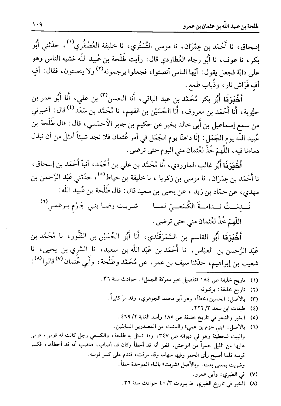 أسحاق نا أحمد بن عمران نا موسى التستري نا خليفة العصفري (1) حدثني أبو بكر نا عوف نا أبو رجاء العطاردي قال رأيت طلحة بن عبيد الله غشيه الناس وهو على دابة فجعل يقول أيها الناس أنصتوا فجعلوا يرجمونه (2) ولا ينصتون فقال أف أف فراش نار وذباب طمع أخبرنا أبو بكر محمد بن عبد الباقي أنا الحسن (3) بن علي أنا أبو عمر بن حيوية أنا أحمد بن معروف أنا الحسين بن الفهم نا محمد بن سعد (4) قال أخبرني من سمع إسماعيل أبن أبي خالد يخبر عن حكيم بن جابر الأحمسي قال قال طلحة بن عبيد الله يوم الجمل إنا داهنا يوم الجمل في أمر عثمان فلا نجد شيئا أمثل من أن نبذل دماءنا فيه اللهم خذ لعثمان مني اليوم حتى ترضى أخبرنا أبو غالب الماوردي أنا محمد بن علي بن أحمد أنبأ أحمد بن إسحاق نا أحمد بن عمران نا موسى بن زكريا نا خليفة بن خياط (5) حدثني عبد الرحمن بن مهدي عن حماد بن زيد عن يحيى بن سعيد قال قال طلحة بن عبيد الله ندمت ندامة الكسعي لما * شريت رضا بني جرم برغمي (6) اللهم خذ لعثمان مني حتى ترضى أخبرنا أبو القاسم بن السمرقندي أنا أبو الحسين بن النقور نا محمد بن عبد الرحمن أبن العباس نا أحمد بن عبد الله بن سعيد نا السري بن يحيى نا شعيب بن إبراهيم حدثنا سيف بن عمر عن محمد وطلحة وأبي عثمان (7) قالوا (8)