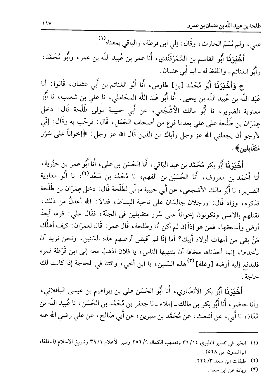 علي ولم يسم الحارث وقال إلي ابن فرطة والباقي بمعناه (1) أخبرنا أبو القاسم بن السمرقندي أنا عمر بن عبيد الله بن عمر وأبو محمد وأبو الغنائم واللفظ له ابنا أبي عثمان ح وأخبرنا أبو محمد بن طاوس أنا أبو الغنائم بن أبي عثمان قالوا أنا عبد الله بن عبيد الله بن يحيى أنا أبو عبد الله المحاملي نا علي بن شعيب نا أبو معاوية الضرير نا أبو مالك الأشجعي عن أبي حبيبة مولى طلحة قال دخل عمران بن طلحة على علي بعدما فرغ من أصحاب الجمل قال فرحب به وقال إني لأرجو أن يجعلني الله عز وجل وأباك من الذين قال الله عز وجل " إخوانا على سرر متقابلين " أخبرنا أبو بكر محمد بن عبد الباقي أنا الحسن بن علي أنا أبو عمر بن حيوية أنا أحمد بن معروف أنا الحسين بن الفهم نا محمد بن سعد (2) نا أبو معاوية الضرير نا أبو مالكا لأشجعي عن أبي حبيبة مولى لطلحة قال دخل عمران بن طلحة فذكره وزاد قال ورجلان جالسان على ناحية البساط فقالا الله أعدل من ذلك تقتلهم بالأمس وتكونون إخوانا على سرر متقابلين في الجنة فقال علي قوما أبعد أرض وأسحقها فمن هو إذا لم أكن أنا وطلحة قال عمر قال لعمران كيف أهلك من بقي من أمهات أولاد أبيك أما إنا لم أقبض أرضهم هذه السنين ونحن نريد أن نأخذها إنما أخذناها مخافة أن ينتهبها الناس يا فلان اذهب معه إلى ابن قرظة فمره فليدفع إليه أرضه وغلة (3) هذه السنين يا ابن أخي وائتنا في الحاجة إذا كانت لك حاجة أخبرنا أبو بكر الأنصاري أنا أبو الحسن علي بن إبراهيم بن عيسى الباقلاني وأنا حاضر أنا أبو بكر بن مالك إملاء نا جعفر بن محمد بن الحسن نا عبيد الله بن معاذ نا أبي عن أشعث عن محمد بن سيرين عن أبي صالح عن علي Bهـ