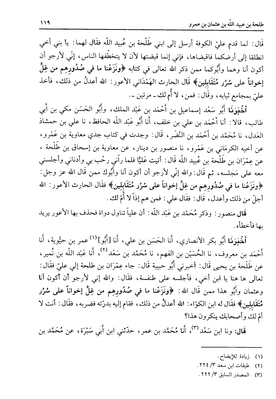 قال لما قدم علي الكوفة أرسل إلى ابني طلحة بن عبيد الله فقال لهما يا بني أخي انطلقا إلى أرضكما فاقبضاها فإني قبضتها لأن لا يتخطفها الناس إني لأرجو أن أكون أنا وهما وأبوكما ممن ذكر الله تعالى في كتابه " ونزعنا ما في صدورهم من غل إخوانا على سرر متقابلين " قال الحارث الهمداني الأعور الله أعدل من ذلك فأخذ علي بمجامع ثيابه وقال فمن لا أم لك مرتين أخبرنا أبو سعد إسماعيل بن أحمد بن عبد الملك وأبو الحسن مكي بن أبي طالب قالا أنا أحمد بن علي بن خلف أنا أبو عبد الله الحافظ نا علي بن حمشاذ العدل نا محمد بن أحمد بن النضر قال وجدت في كتاب جدي معاوية بن عمرو عن أخيه الكرماني بن عمرو نا منصور بن دينار عن معاوية بن إسحاق بن طلحة عن عمران بن طلحة بن عبيد الله قال أتيت عليا فلما رآني رحب بي وأدناني وأجلسني معه على مجلسه ثم قال والله إني لأرجو أن أكون أنا وأبوك ممن قال الله عز وجل " ونزعنا ما في صدورهم من غل على سرر متقابلين " فقال الحارث الأعور الله أجل من ذلك وأعدل قال فقال علي فمن هم إذا لا أم لك قال منصور وذكر محمد بن عبد الله أن عليا تناول دواة فحذف بها الأعور يريد بها فأخطأه أخبرنا أبو بكر الأنصاري أنا الحسن بن علي أنا أبو (1) عمر بن حيوية أنا أحمد بن معروف نا الحسين بن الفهم نا محمد بن سعد (2) أنا عبد الله بن نمير عن طلحة بن يحيى قال أخبرني أبو حبيبة قال جاء عمران بن طلحة إلى علي فقال تعالى ها هنا يا ابن أخي فأجلسه على طنفسة فقال والله إني لأرجو أن أكون أنا وعثمان وأبو هذا ممن قال الله " ونزعنا ما في صدورهم من غل إخوانا على سرر متقابلين " فقال له ابن الكواء الله أعدل من ذلك فقام إليه بدرته فضربه فقال أنت لا أم لك وأصحابك ينكرون هذا قال ونا ابن سعد (3) أنا محمد بن عمر حدثني ابن أبي سبرة عن محمد بن
