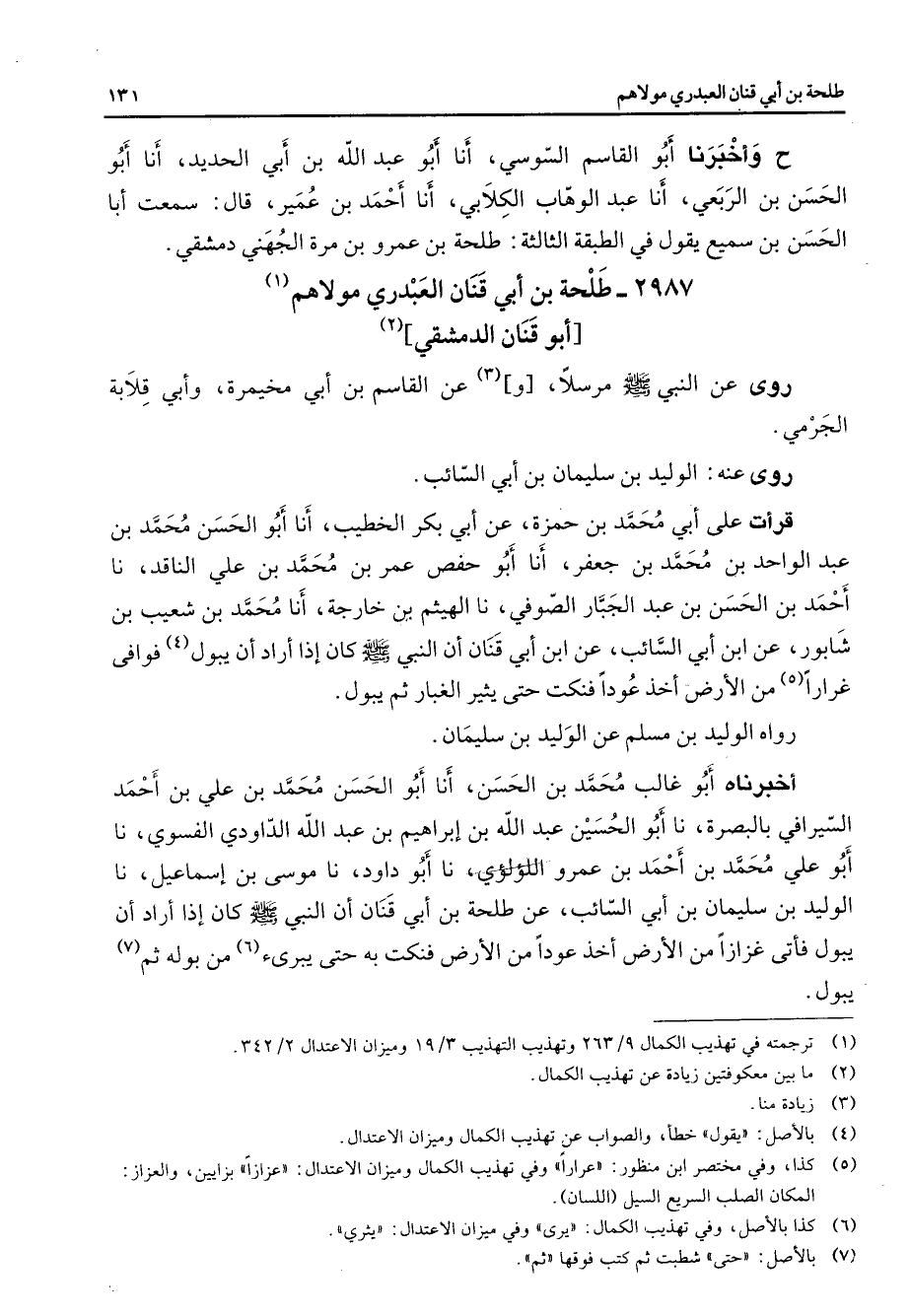 2987 - طلحة بن أبي قنان العبدري مولاهم (1) أبو قنان الدمشقي (2) روى عن النبي (صلى الله عليه وسلم) مرسلا [و] (3) عن القاسم بن أبي مخيمرة وأبي قلابة الجرمي روى عنه الوليد بن سليمان بن أبي السائب قرأت على أبي محمد بن حمزة عن أبي بكر الخطيب أنا أبو الحسن محمد بن عبد الواحد بن محمد بن جعفر أنا أبو حفص عمر بن محمد بن علي الناقد نا أحمد بن الحسن بن عبد الجبار الصوفي نا الهيثم بن خارجة أنا محمد بن شعيب بن شابور عن ابن أبي السائب عن ابن أبي قنان أن النبي (صلى الله عليه وسلم) كان إذا أراد أن يبول (4) فوافى غرارا (5) من الأرض أخذ عودا فنكت حتى يثير الغبار ثم يبول رواه الوليد بن مسلم عن الوليد بن سليمان أخبرناه أبو غالب محمد بن الحسن أنا أبو الحسن محمد بن علي بن أحمد السيرافي بالبصرة نا أبو الحسين عبد الله بن إبراهيم بن عبد الله الداودي الفسوي نا أبو علي محمد بن أحمد بن عمرو اللؤلؤي نا أبو داود نا موسى بن إسماعيل نا الوليد بن سليمان بن أبي السائب عن طلحة بن أبي قنان أن النبي (صلى الله عليه وسلم) كان إذا أراد أن يبول فأتى غزازا من الأرض أخذ عودا من الأرض فنكت به حتى يبرئ (6) من بوله ثم (7) يبول