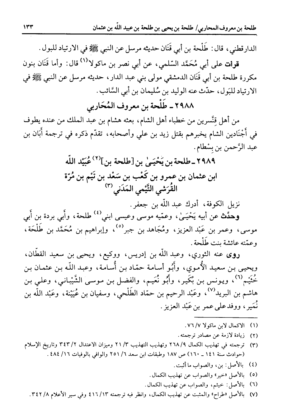 الدارقطني قال طلحة بن أبي قنان حديثه مرسل عن النبي (صلى الله عليه وسلم) في الارتياد للبول قرأت على أبي محمد السلمي عن أبي نصر بن ماكولا (1) قال وأما قنان بنون مكررة طلحة بن أبي قنان الدمشقي مولى بني عبد الدار حديثه مرسل عن النبي (صلى الله عليه وسلم) في الارتياد للبول حدث عنه الوليد بن سليمان بن أبي السائب 2988 - طلحة بن معروف المحاربي من أهل قنسرين من خطباء أهل الشام بعثه هشام بن عبد الملك من عنده يطوف في أجنادين الشام يخبرهم بقتل زيد بن علي وأصحابه تقدم ذكره في ترجمة أبان بن عبد الرحمن بن بسطام