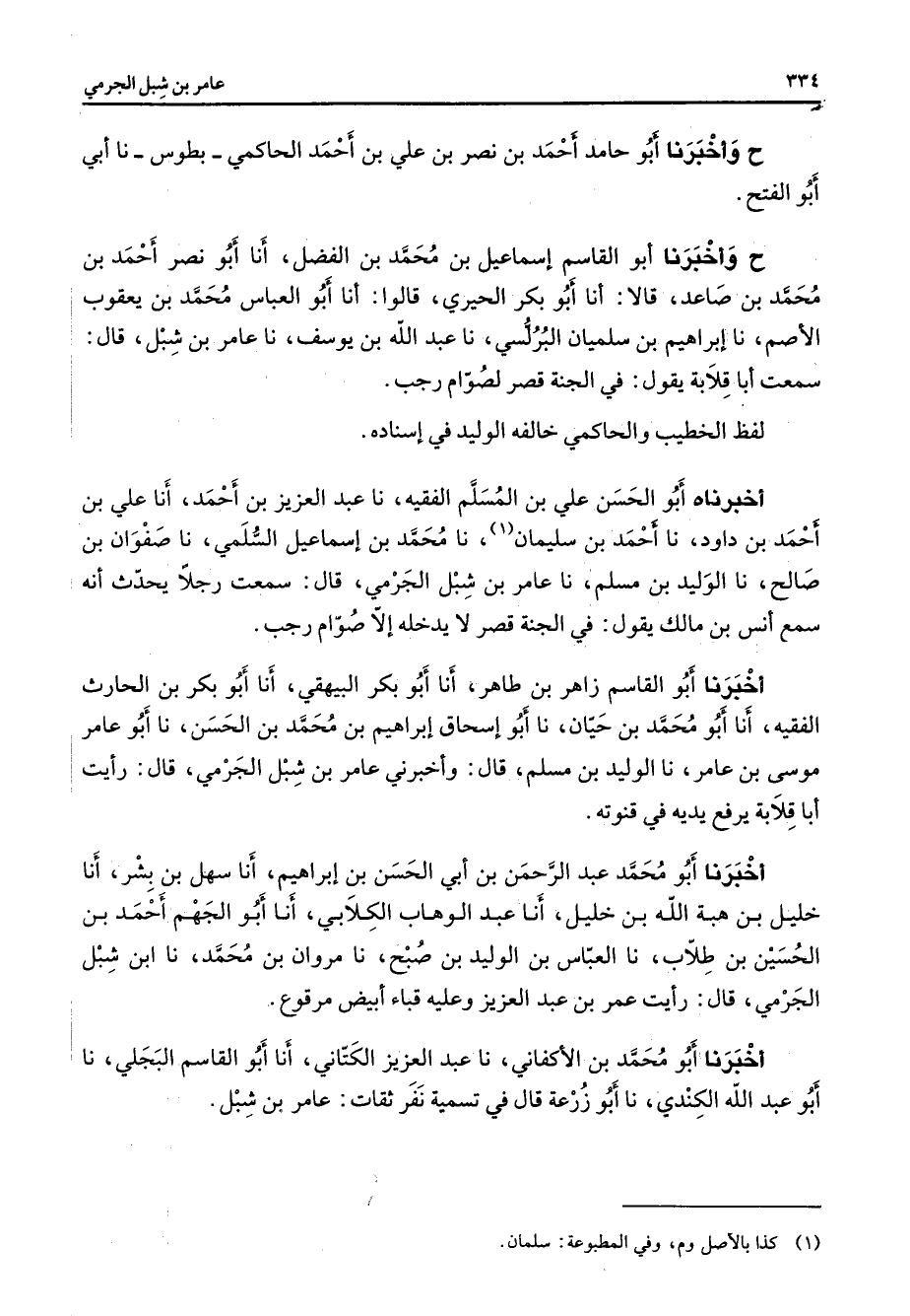 ح وأخبرنا أبو حامد أحمد بن نصر بن علي بن أحمد الحاكمي بطوس نا أبي أبو الفتح ح وأخبرنا أبو القاسم إسماعيل بن محمد بن الفضل أنا أبو نصر أحمد بن محمد بن صاعد قالا أنا أبو بكر الحيري قالوا أنا أبو العباس محمد بن يعقوب الأصم نا إبراهيم بن سليمان البرلسي نا عبد الله بن يوسف نا عامر بن شبل قال سمعت أبا قلابة يقول في الجنة قصر لصوام رجب لفظ الخطيب والحاكمي خالفه الوليد في إسناده أخبرناه أبو الحسن علي بن المسلم الفقيه نا عبد العزيز بن أحمد أنا علي بن أحمد بن داود نا أحمد بن سليمان (1) نا محمد بن إسماعيل السلمي نا صفوان بن صالح نا الوليد بن مسلم نا عامر بن شبل الجرمي قال سمعت رجلا يحدث أنه سمع أنس بن مالك يقول في الجنة قصر لا يدخله إلا صوام رجب أخبرنا أبو القاسم زاهر بن طاهر أنا أبو بكر البيهقي أنا أبو بكر بن الحارث الفقيه أنا أبو محمد بن حيان نا أبو إسحاق إبراهيم بن محمد بن الحسن نا أبو عامر موسى بن عامر نا الوليد بن مسلم قال وأخبرني عامر بن شبل الجرمي قال رأيت أبا قلابة يرفع يديه في قنوته أخبرنا أبو محمد عبد الرحمن بن أبي الحسن بن إبراهيم أنا سهل بن بشر أنا خليل بن هبة الله بن خليل أنا عبد الوهاب الكلابي أنا أبو الجهم أحمد بن الحسين بن طلاب نا العباس بن الوليد بن صبح نا مروان بن محمد نا ابن شبل الجرمي قال رأيت عمر بن عبد العزيز وعليه قباء أبيض مرقوع أخبرنا أبو محمد بن الأكفاني نا عبد العزيز الكتاني أنا أبو القاسم البجلي نا أبو عبد الله الكندي نا أبو زرعة قال في تسمية نفر ثقات عامر بن شبل