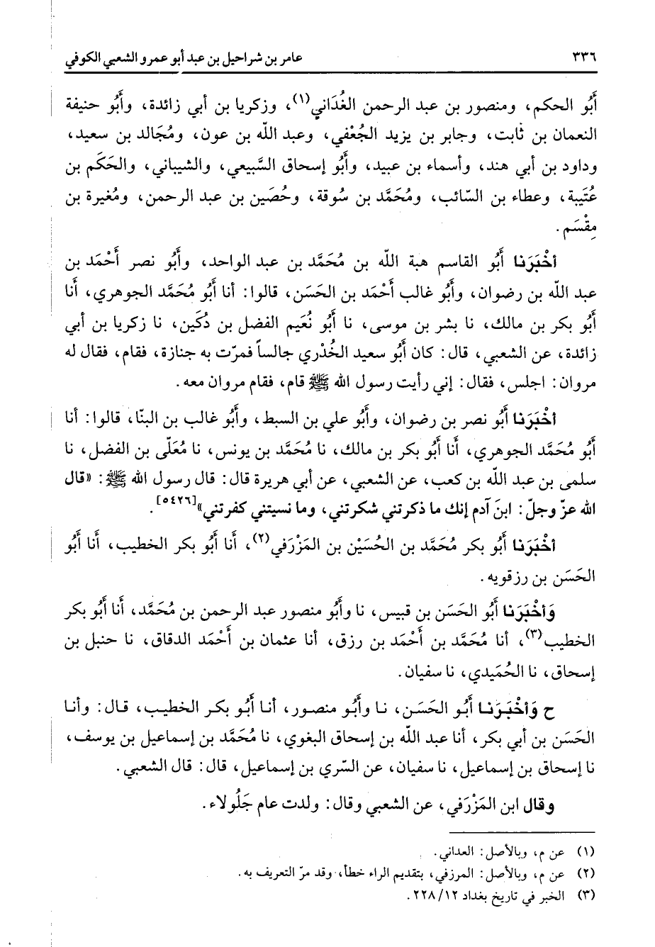 أبو الحكم ومنصور بن عبد الرحمن الغداني (1) وزكريا بن أبي زائدة وأبو حنيفة النعمان بن ثابت وجابر بن يزيد الجعفي وعبد الله بن عون ومجالد بن سعيد وداود بن أبي هند وأسماء بن عبيد وأبو إسحاق السبيعي والشيباني والحكم بن عتيبة وعطاء بن السائب ومحمد بن سوقة وحصين بن عبد الرحمن ومغيرة بن مقسم أخبرنا أبو القاسم هبة الله بن محمد بن عبد الواحد وأبو نصر أحمد بن عبد الله بن رضوان وأبو غالب أحمد بن الحسن قالوا أنا أبو محمد الجوهري أنا أبو بكر بن مالك نا بشر بن موسى نا أبو نعيم الفضل بن دكين نا زكريا بن أبي زائدة عن الشعبي قال أبو سعيد الخدري جالسا فمرت به جنازة فقام فقال له مروان اجلس فقال إني رأيت رسول الله (صلى الله عليه وسلم) قام فقام مروان معه أخبرنا أبو نصر بن رضوان وأبو علي بن البسط وأبو غالب بن البنا قالوا أنا أبو محمد الجوهري أنا أبو بكر بن مالك نا محمد بن يونس نا معلى بن الفضل نا سلمى بن عبد الله بن كعب عن الشعبي عن أبي هريرة قال قال رسول الله (صلى الله عليه وسلم) قال الله عز وجل ابن آدم إنك ما ذكرتني شكرتني وما نسيتني كفرتني أخبرنا أبو بكر محمد بن الحسين بن المزرفي (2) أنا أبو بكر الخطيب أنا أبو الحسن بن رزقويه وأخبرنا أبو الحسن بن قبيس نا وأبو منصور عبد الرحمن بن محمد أنا أبو بكر الخطيب (3) أنا محمد بن أحمد بن رزق أنا عثمان بن أحمد الدقاق نا حنبل بن إسحاق نا الحميدي نا سفيان ح وأخبرنا أبو الحسن نا وأبو منصور أنا أبو بكر الخطيب قال وأنا الحسن بن أبي بكر أنا عبد الله بن إسحاق البغوي نا محمد بن إسماعيل بن يوسف نا إسحاق بن إسماعيل نا سفيان عن السري بن إسماعيل قال قال الشعبي وقال ابن المزرفي عن الشعبي وقال ولدت عام جلولاء