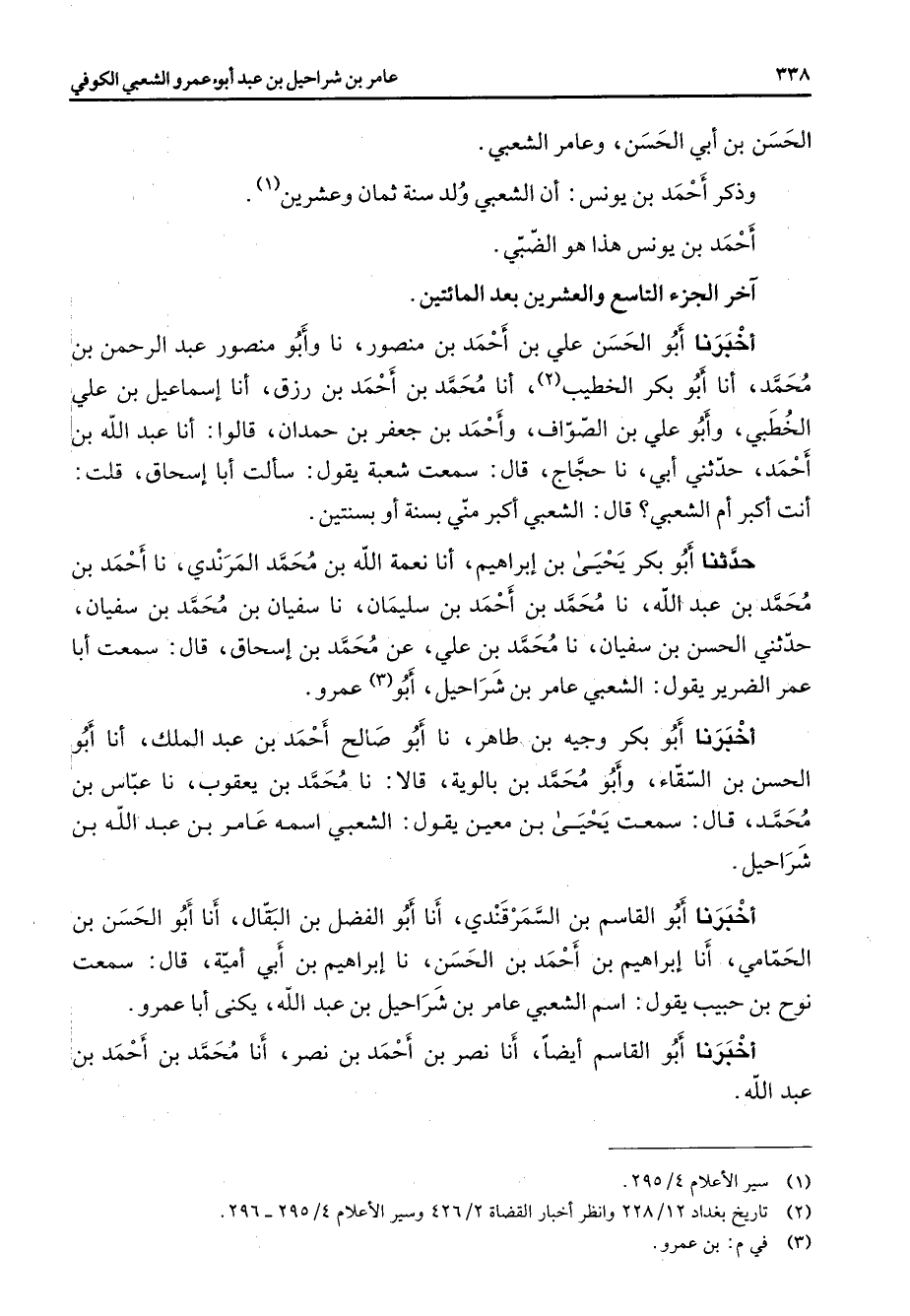 الحسن بن أبي الحسن وعامر الشعبي وذكر أحمد بن يونس أن الشعبي ولد سنة ثمان وعشرين (1) أحمد بن يونس هذا هو الضبي آخر الجزء التاسع والعشرين بعد المائتين أخبرنا أبو الحسن علي بن أحمد بن منصور نا وأبو منصور عبد الرحمن بن محمد أنا أبو بكر الخطيب (2) أنا محمد بن أحمد بن رزق أنا إسماعيل بن علي الخطبي وأبو علي بن الصواف وأحمد بن جعفر بن حمدان قالوا أنا عبد الله بن أحمد حدثني أبي نا حجاج قال سمعت شعبة يقول سألت أبا إسحاق قلت أنت أكبر أم الشعبي قال الشعبي أكبر مني بسنة أو بسنتين حدثنا أبو بكر يحيى بن إبراهيم أنا نعمة الله بن محمد المرندي نا أحمد بن محمد بن عبد الله نا محمد بن أحمد بن سليمان نا سفيان بن محمد بن سفيان حدثني الحسن بن سفيان نا محمد بن علي عن محمد بن إسحاق قال سمعت أبا عمر الضرير يقول الشعبي عامر بن شراحيل أبو (3) عمرو أخبرنا أبو بكر وجيه بن طاهر نا أبو صالح أحمد بن عبد الملك أنا أبو الحسن بن السقاء وأبو محمد بن بالوية قالا نا محمد بن يعقوب نا عباس بن محمد قال سمعت يحيى بن معين يقول الشعبي اسمه عامر بن عبد الله بن شراحيل أخبرنا أبو القاسم السمرقندي أنا أبو الفضل بن البقال أنا أبو الحسن بن الحمامي أنا إبراهيم بن أحمد بن الحسن نا إبراهيم بن أبي أمية قال سمعت نوح بن حبيب يقول اسم الشعبي عامر بن شراحيل بن عبد الله يكنى أبا عمرو أخبرنا أبو القاسم أيضا أنا نصر بن أحمد بن نصر أنا محمد بن أحمد بن عبد الله