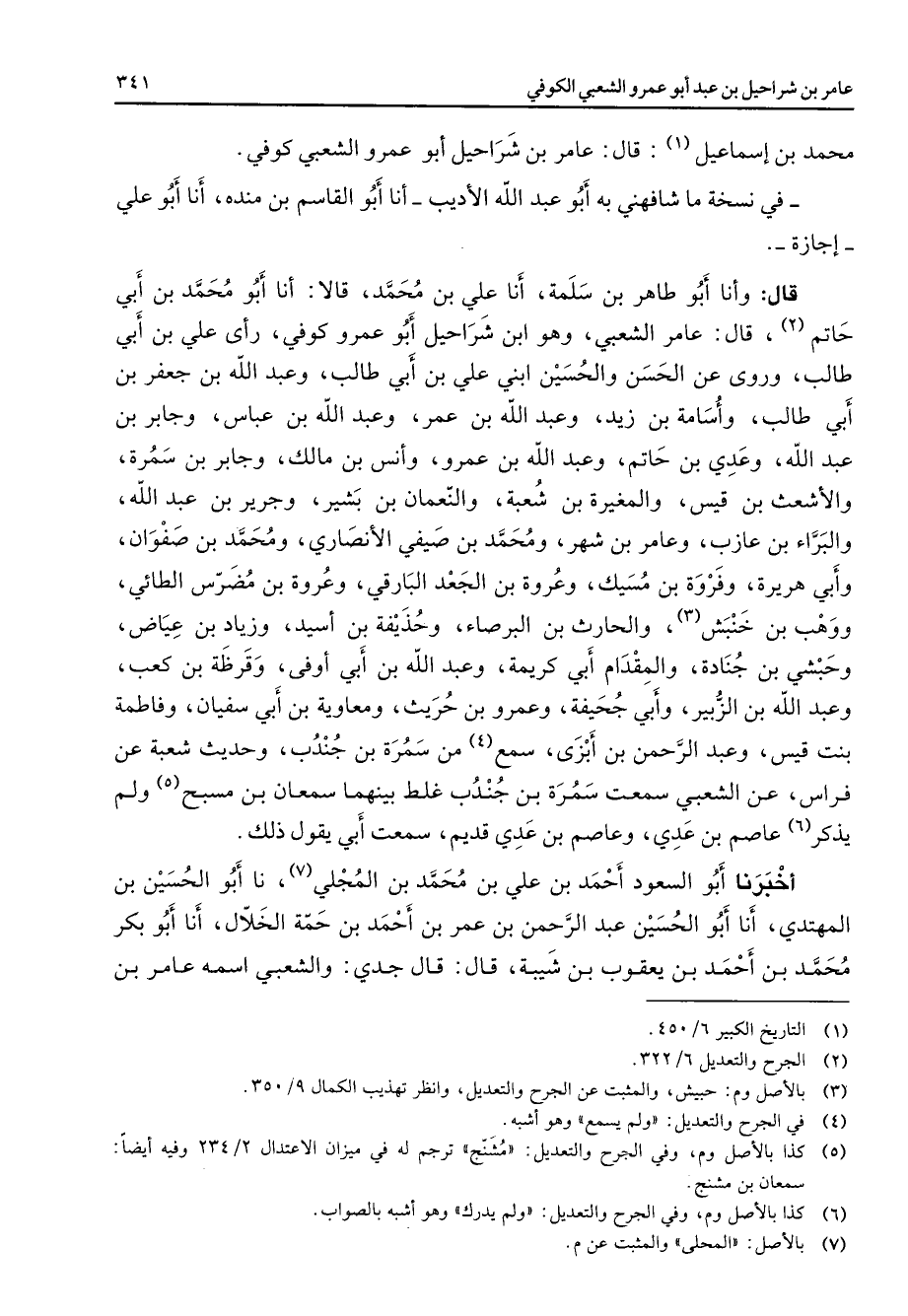محمد بن إسماعيل (1) قال عامر بن شراحيل أبو عمرو الشعبي كوفي في نسخة ما شافهني به أبو عبد الله الأديب أنا أبو القاسم بن منده أنا أبو علي إجازة قال وأنا أبو طاهر بن سلمة أنا علي بن محمد قالا أنا أبو محمد بن أبي إ حاتم (2) قال عامر الشعبي وهو ابن شراحيل أبو عمرو كوفي رأى علي بن أبي طالب وروى عن الحسن والحسين ابني علي بن أبي طالب وعبد الله بن جعفر بن أبي طالب وأسامة بن زيد وعبد الله بن عمر وعبد الله بن عباس وجابر بن عبد الله وعدي بن حاتم وعبد الله بن عمرو وأنس بن مالك وجابر بن سمرة والأشعث بن قيس والمغيرة بن شعبة والنعمان بن بشير وجرير بن عبد الله والبراء بن عازب وعامر بن شهر ومحمد بن صيفي الأنصاري ومحمد بن صفوان وأبي هريرة وفروة بن مسيك وعروة بن الجعد البارقي وعروة بن مضرس الطائي ووهب بن خنبش (3) والحارث بن البرصاء وحذيفة بن أسيد وزياد بن عياض وحبشي بن جنادة والمقدام أبي كريمة وعبد الله بن أبي أوفى وقرظة بن كعب وعبد الله بن الزبير وأبي جحيفة وعمرو بن حريث ومعاوية بن أبي سفيان وفاطمة بنت قيس وعبد الرحمن بن أبزى سمع (4) من سمرة بن جندب وحديث شعبة عن فراس عن الشعبي سمعت سمرة بن جندب غلط بينهما سمعان بن مسبح (5) ولم يذكر (6) عاصم بن عدي وعاصم بن عدي قديم سمعت أبي يقول ذلك أخبرنا أبو السعود أحمد بن علي بن محمد بن المجلي (7) نا أبو الحسين بن المهتدي أنا أبو الحسين عبد الرحمن بن عمر بن أحمد بن حمة الخلال أنا أبو بكر محمد بن أحمد بن يعقوب بن شيبة قال قال جدي والشعبي اسمه عامر بن