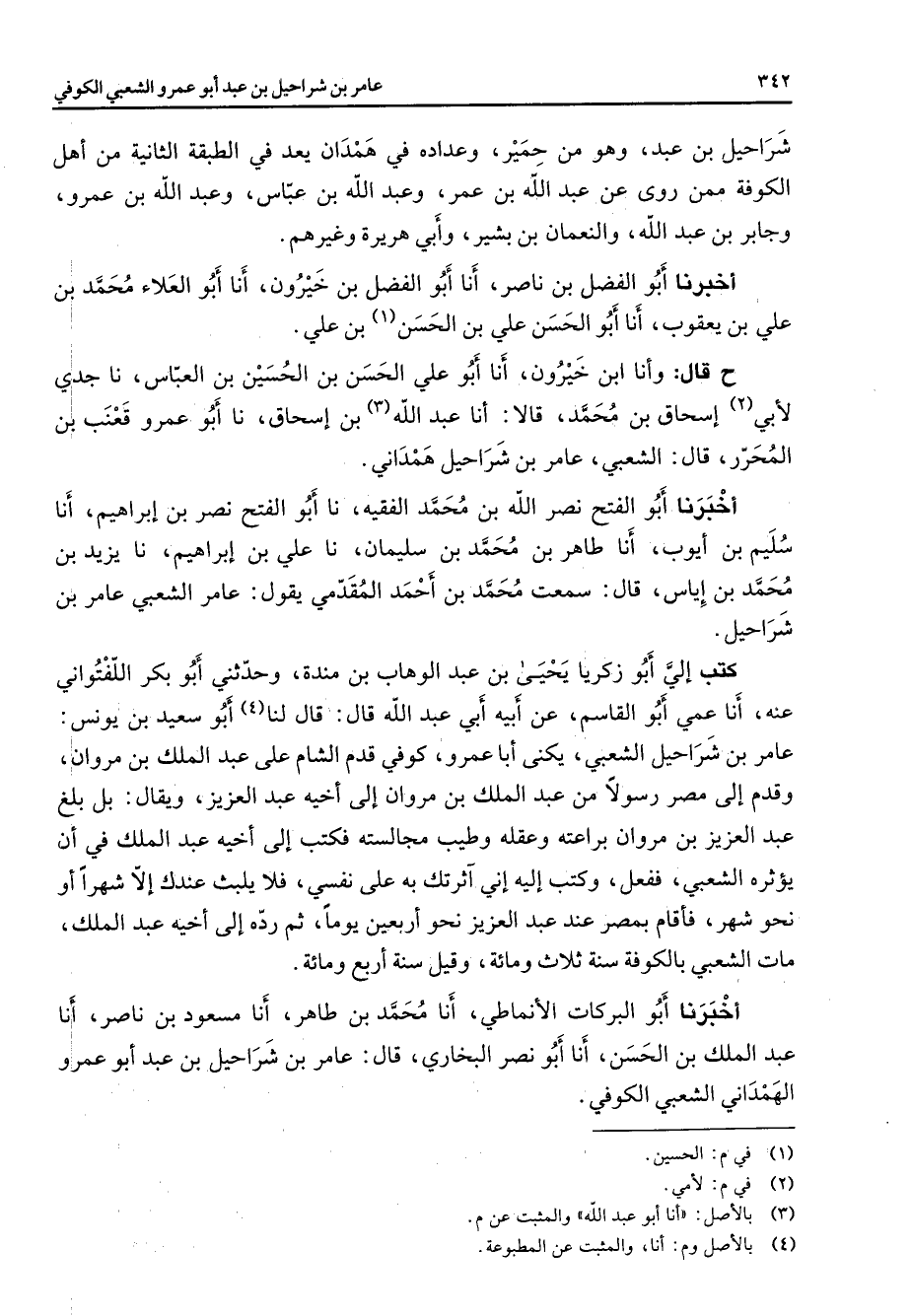 شراحيل بن عبد وهو من حمير وعداده في همدان يعد في الطبقة الثانية من أهل الكوفة ممن روى عن عبد الله بن عمر وعبد الله بن عباس وعبد الله بن عمرو وجابر بن عبد الله والنعمان بن بشير وأبي هريرة وغيرهم أخبرنا أبو الفضل بن ناصر أنا أبو الفضل بن خيرون أنا أبو العلاء محمد بن علي بن يعقوب أنا أبو الحسن علي بن الحسن (1) بن علي ح قال وأنا ابن خيرون أنا أبو علي الحسن بن الحسين بن العباس نا جدي لأبي (2) إسحاق بن محمد قالا أنا عبد الله (3) بن إسحاق نا أبو عمرو قعنب بن المحرر قال الشعبي عامر بن شراحيل همداني أخبرنا أبو الفتح نصر الله بن محمد الفقيه نا أبو الفتح نصر بن إبراهيم أنا سليم بن أيوب أنا طاهر بن محمد بن سليمان نا علي بن إبراهيم نا يزيد بن محمد بن إياس قال سمعت محمد بن أحمد المقدمي يقول عامر الشعبي عامر بن شراحيل كتب إلي أبو زكريا يحيى بن عبد الوهاب بن مندة وحدثني أبو بكر اللفتواني عنه أنا عمي أبو القاسم عن أبيه أبي عبد الله قال قال لنا (4) أبو سعيد بن يونس عامر بن شراحيل الشعبي يكنى أبا عمرو كوفي قدم الشام على عبد الملك بن مروان وقدم إلى مصر رسولا من عبد الملك بن مروان إلى أخيه عبد العزيز ويقال بل بلغ عبد العزيز بن مروان براعته وعقله وطيب مجالسته فكتب إلى أخيه عبد الملك في أن يؤثره الشعبي ففعل وكتب إليه إني آثرتك به على نفسي فلا يلبث عندك إلا شهرا أو نحو شهر فأقام بمصر عند عبد العزيز نحو أربعين يوما ثم رده إلى أخيه عبد الملك مات الشعبي بالكوفة سنة ثلاث ومائة وقيل سنة أربع ومائة أخبرنا أبو البركات الأنماطي أنا محمد بن طاهر أنا مسعود بن ناصر أنا عبد الملك بن الحسن أنا أبو نصر البخاري قال عامر بن شراحيل بن عبد أبو عمرو الهمداني الشعبي الكوفي
