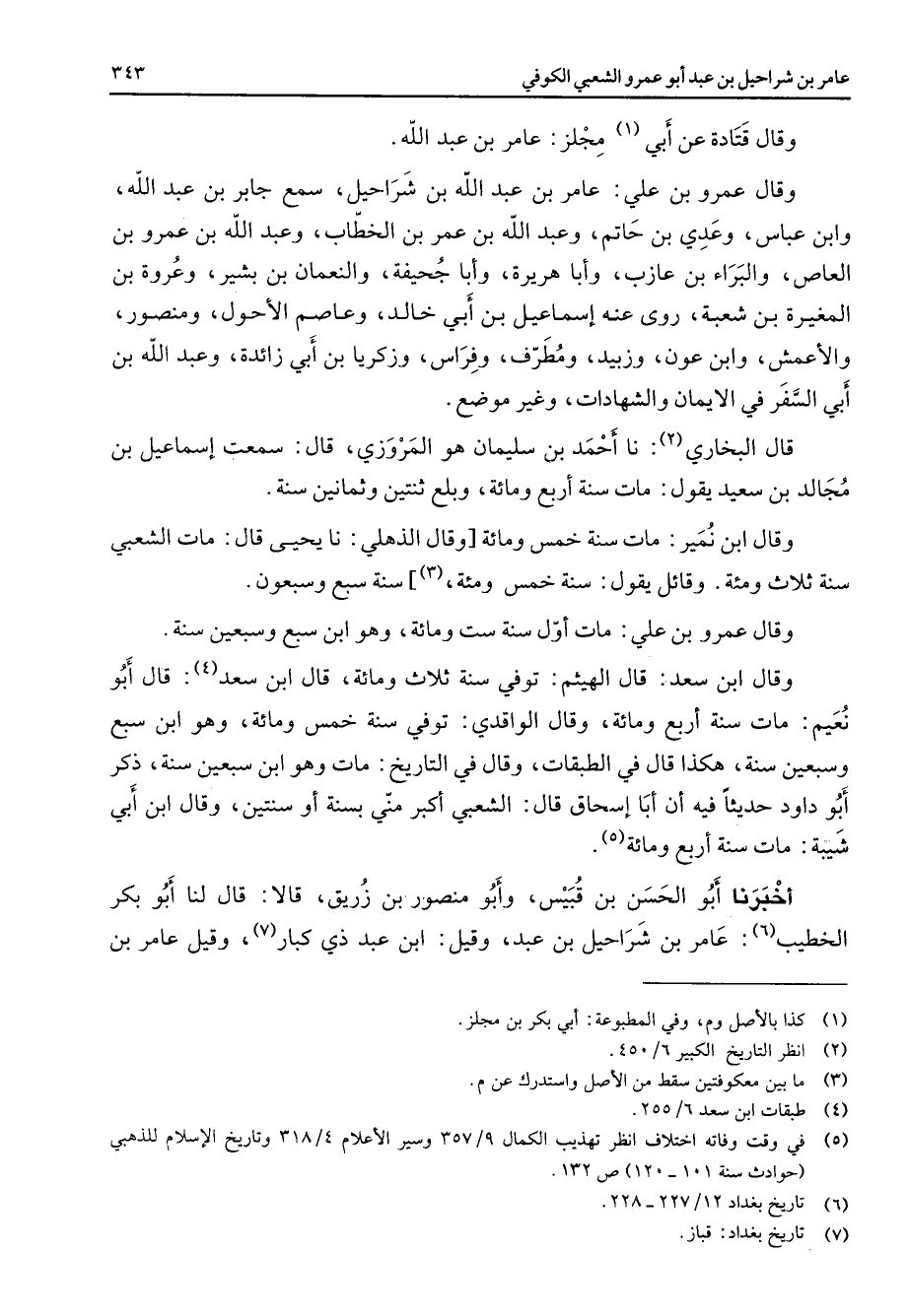 وقال قتادة عن أبي (1) مجلز عامر بن عبد الله وقال عمرو بن علي عامر بن عبد الله بن شراحيل سمع جابر بن عبد الله وابن عباس وعدي بن حاتم وعبد الله بن عمر بن الخطاب وعبد الله بن عمرو بن العاص والبراء بن عازب وأبا هريرة وأبا جحيفة والنعمان بن بشير وعروة بن المغيرة بن شعبة روى عنه إسماعيل بن أبي خالد وعاصم الأحول ومنصور والأعمش وابن عون وزبيد ومطرف وفراس وزكريا بن أبي زائدة وعبد الله بن أبي السفر في الإيمان والشهادات وغير موضع قال البخاري (2) نا أحمد بن سليمان هو المروزي قال سمعت إسماعيل بن مجالد بن سعيد يقول مات سنة أربع ومائة وبلغ ثنتين وثمانين سنة وقال ابن نمير مات سنة خمس ومائة وقال الذهلي نا يحيى قال مات الشعبي سنة ثلاث ومئة وقائل يقول سنة خمس ومئة (3) سنة سبع وسبعون وقال عمرو بن علي مات أول سنة ست ومائة وهو ابن سبع وسبعين سنة وقال ابن سعد قال الهيثم توفي سنة ثلاث ومائة قال ابن سعد (4) قال أبو نعيم مات سنة أربع ومائة وقال الواقدي توفي سنة خمس ومائة وهو ابن سبع وسبعين سنة هكذا قال في الطبقات وقال في التاريخ مات وهو ابن سبعين سنة ذكر أبو داود حديثا فيه أن أبا إسحاق قال الشعبي أكبر مني بسنة أو سنتين وقال ابن أبي شيبة مات سنة أربع ومائة (5) أخبرنا أبو الحسن بن قبيس وأبو منصور بن زريق قالا قال لنا أبو بكر الخطيب (6) عامر بن شراحيل بن عبد وقيل ابن عبد ذي كبار (7) وقيل عامر بن