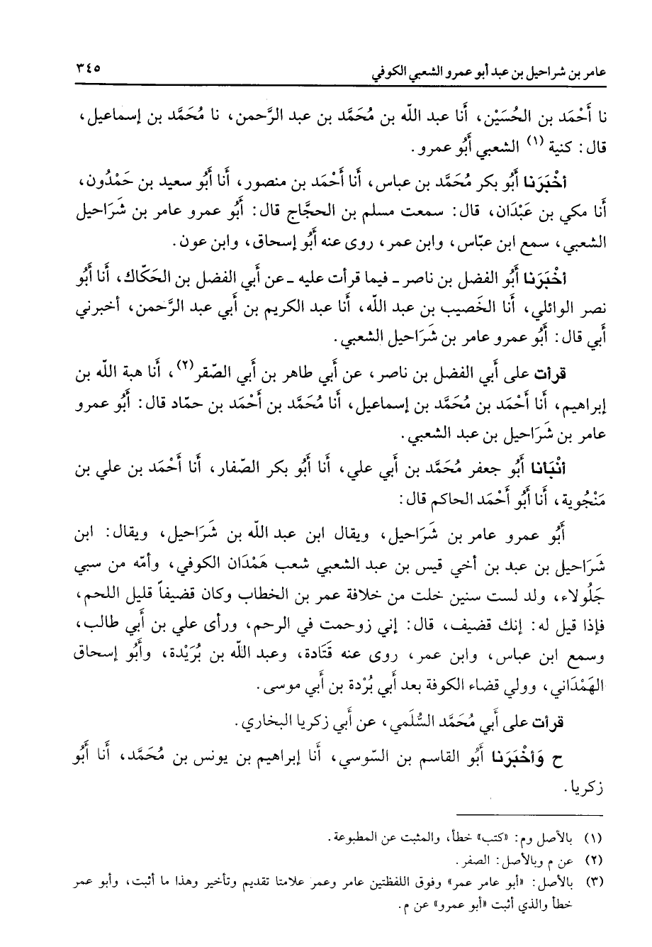 نا أحمد بن الحسين أنا عبد الله بن محمد بن عبد الرحمن نا محمد بن إسماعيل قال كنية (1) الشعبي أبو عمرو أخبرنا أبو بكر محمد بن عباس أنا أحمد بن منصور أنا أبو سعيد بن حمدون أنا مكي بن عبدان قال سمعت مسلم بن الحجاج قال أبو عمرو عامر بن شراحيل الشعبي سمع ابن عباس وابن عمر روى عنه أبو إسحاق وابن عون أخبرنا أبو الفضل بن ناصر فيما قرأت عليه عن أبي الفضل بن الحكاك أنا أبو نصر الوائلي أنا الخصيب بن عبد الله أنا عبد الكريم بن أبي عبد الرحمن أخبرني أبي قال أبو عمر وعامر بن شراحيل الشعبي قرأت على أبي الفضل بن ناصر عن أبي طاهر بن أبي الصقر (2) أنا هبة الله بن إبراهيم أنا أحمد بن محمد بن إسماعيل أنا محمد بن أحمد بن حماد قال أبو عمرو عامر بن شراحيل بن عبد الشعبي أنبأنا أبو جعفر محمد بن أبي علي أنا أبو بكر الصفار أنا أحمد بن علي بن منجوية أنا أبو أحمد الحاكم قال أبو عمرو عامر بن شراحيل ويقال ابن عبد الله بن شراحيل ويقال ابن شراحيل بن عبد بن أخي قيس بن عبد الشعبي شعب همدان الكوفي وأمه من سبي جلولاء ولد لست سنين خلت من خلافة عمر بن الخطاب وكان قضيفا قليل اللحم فإذا قيل له إنك قضيف قال إني زوحمت في الرحم ورأى علي بن أبي طالب وسمع ابن عباس وابن عمر روى عنه قتادة وعبد الله بن بريدة وأبو إسحاق الهمداني وولي قضاء الكوفة بعد أبي بردة بن أبي موسى قرأت على أبي محمد السلمي عن أبي زكريا البخاري ح وأخبرنا أبو القاسم بن السوسي أنا إبراهيم بن يونس بن محمد أنا أبو زكريا