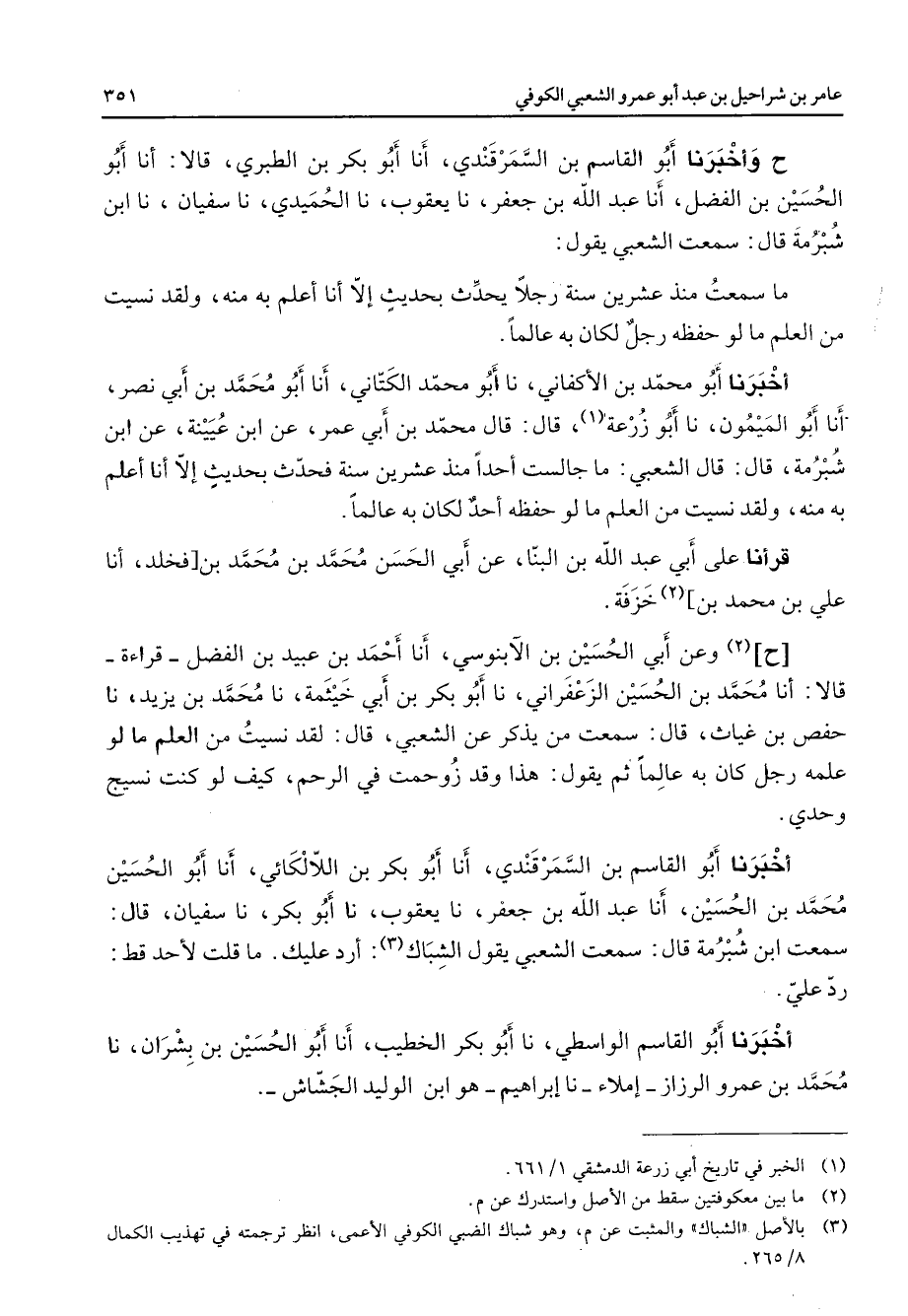 ح وأخبرنا أبو القاسم بن السمرقندي أنا أبو بكر الطبري قالا أنا أبو الحسين بن الفضل أنا عبد الله بن جعفر نا يعقوب نا الحميدي نا سفيان نا ابن شبرمة قال سمعت الشعبي يقول ما سمعت منذ عشرين سنة رجلا يحدث بحديث إلا أنا أعلم به منه ولقد نسيت من العلم ما لو حفظه رجل لكان به عالما أخبرنا أبو محمد بن الأكفاني نا أبو محمد الكتاني أنا أبو محمد بن أبي نصر أنا أبو ميمون نا أبو زرعة (1) قال قال محمد بن أبي عمر عن ابن عيينة عن ابن شبرمة قال قال الشعبي ما جالست أحدا منذ عشرين سنة فحدث بحديث إلا أنا أعلم به منه ولقد نسيت من العلم ما لو حفظه أحد لكان به عالما قرأنا على أبي عبد الله بن البنا عن أبي الحسن محمد بن محمد بن فخلد أنا علي بن محمد بن (2) خزفة ح (2) وعن أبي الحسين بن الآبنوسي أنا أحمد بن عبيد بن الفضل قراءة قالا أنا محمد بن الحسين الزعفراني نا أبو بكر بن أبي خيثمة نا محمد بن يزيد نا حفص بن غياث قال سمعت من يذكر عن الشعبي قال لقد نسيت من العلم ما لو علمه رجل لكان به عالما ثم يقول هذا وقد زوحمت في الرحم كيف لو كنت نسيج وحدي أخبرنا أبو القاسم بن السمرقندي أنا أبو بكر بن اللالكائي أنا أبو الحسين محمد بن الحسين أنا عبد الله بن جعفر نا يعقوب نا أبو بكر نا سفيان قال سمعت ابن شبرمة قال سمعت الشعبي يقول الشباك (3) أرد عليك ما قلت لأحد قط رد علي أخبرنا أبو القاسم الواسطي نا أبو بكر الخطيب أنا أبو الحسين بن بشران نا محمد بن عمرو الرزاز إملاء نا إبراهيم هو ابن الوليد الجشاش