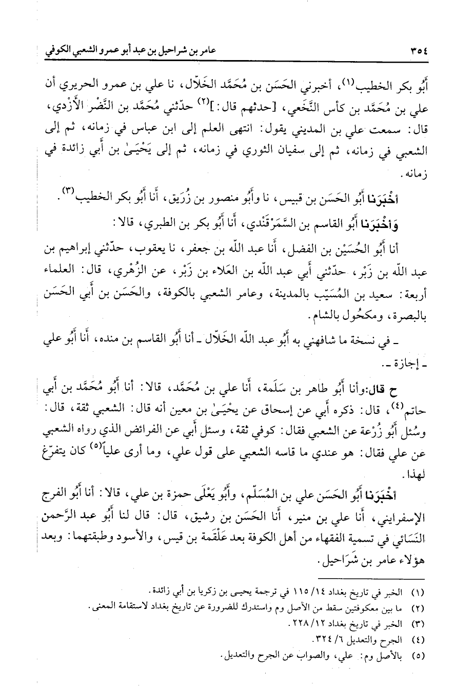 أبو بكر الخطيب (1) أخبرني الحسن بن محمد الخلال نا علي بن عمرو الحريري أن علي بن محمد بن كأس النخعي حدثهم قال (2) حدثني محمد بن النضر الأزدي قال سمعت علي بن المديني يقول انتهى العلم إلى ابن عباس في زمانه ثم إلى الشعبي في زمانه ثم إلى سفيان الثوري في زمانه ثم إلى يحيى بن أبي زائدة في زمانه أخبرنا أبو الحسن بن قبيس نا وأبو منصور بن زريق أنا أبو بكر الخطيب (3) وأخبرنا أبو القاسم بن السمرقندي أنا أبو بكر بن الطبري قالا أنا أبو الحسين بن الفضل أنا عبد الله بن جعفر نا يعقوب حدثني إبراهيم بن عبد الله بن زبر حدثني أبي عبد الله بن العلاء بن زبر عن الزهري قال العلماء أربعة سعيد بن المسيب بالمدينة وعامر الشعبي بالكوفة والحسن بن أبي الحسن بالبصرة ومكحول بالشام في نسخة ما شافهني به أبو عبد الله الخلال أنا أبو القاسم بن منده أنا أبو علي إجازة ح قال وأنا أبو طاهر بن سلمة أنا علي بن محمد قالا أنا أبو محمد بن أبي حاتم (4) قال ذكره أبي عن إسحاق عن يحيى بن معين أنه قال الشعبي ثقة قال وسئل أبو زرعة عن الشعبي فقال كوفي ثقة وسئل أبي عن الفرائض الذي رواه الشعبي عن علي فقال هو عندي ما قاسه الشعبي على قول علي وما أرى عليا (5) كان يتفرغ لهذا أخبرنا أبو الحسن علي بن المسلم وأبو يعلى حمزة بن علي قالا أنا أبو الفرج الإسفرايني أنا علي بن منير أنا الحسن بن رشيق قال قال لنا أبو عبد الرحمن النسائي في تسمية الفقهاء من أهل الكوفة بعد علقمة بن قيس والأسود وطبقتهما وبعد هؤلاء عامر بن شراحيل