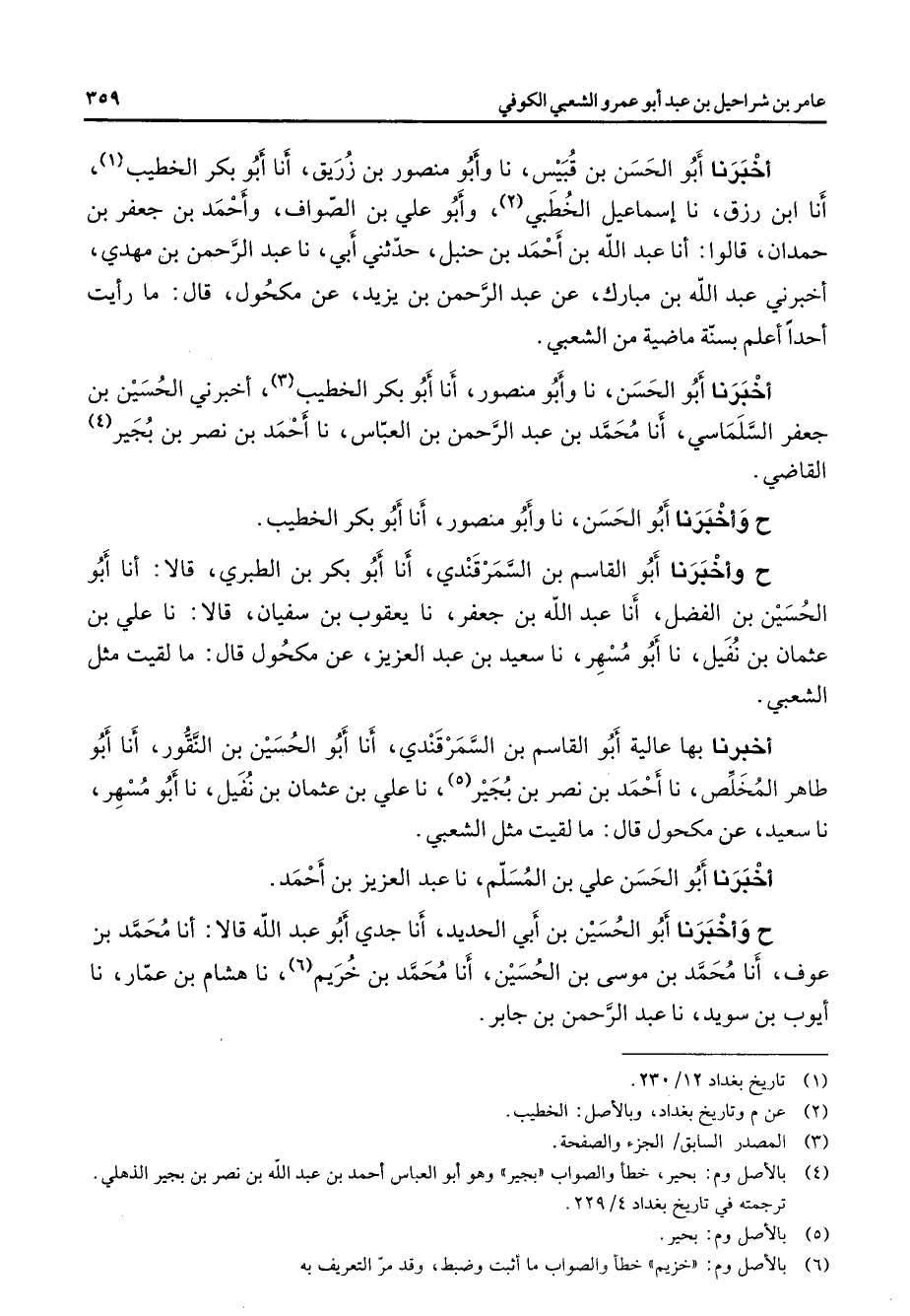 أخبرنا أبو الحسن بن قبيس نا وأبو منصور بن زريق أنا أبو بكر الخطيب (1) أنا ابن رزق نا إسماعيل الخطبي (2) وأبو علي بن الصواف وأحمد بن جعفر بن حمدان قالوا أنا عبد الله بن أحمد بن حنبل حدثني أبي نا عبد الرحمن بن مهدي أخبرني عبد الله بن مبارك عن عبد الرحمن بن يزيد عن مكحول قال ما رأيت أحدا أعلم بسنة ماضية من الشعبي أخبرنا أبو الحسن نا وأبو منصور أنا أبو بكر الخطيب (3) أخبرني الحسين بن جعفر السلماسي أنا محمد بن عبد الرحمن بن العباس نا أحمد بن نصر بن بجير (4) القاضي ح وأخبرنا أبو الحسن نا وأبو منصور أنا أبو بكر الخطيب ح وأخبرنا أبو القاسم بن السمرقندي أنا أبو بكر بن الطبري قالا أنا أبو الحسين بن الفضل أنا عبد الله بن جعفر نا يعقوب بن سفيان قالا نا علي بن عثمان بن نفيل نا أبو مسهر نا سعيد بن عبد العزيز عن مكحول قال ما لقيت مثل الشعبي أخبرنا بها عالية أبو القاسم بن السمرقندي أنا أبو الحسين بن النقور أنا أبو طاهر المخلص نا أحمد بن نصر بن بجير (5) نا علي بن عثمان بن نفيل نا أبو مسهر نا سعيد عن مكحول قال ما لقيت مثل الشعبي أخبرنا أبو الحسن علي بن المسلم نا عبد العزيز بن أحمد ح وأخبرنا أبو الحسين بن أبي الحديد أنا جدي أبو عبد الله قالا أنا محمد بن عوف أنا محمد بن موسى بن الحسين أنا محمد بن خريم (6) نا هشام بن عمار نا أيوب بن سويد نا عبد الرحمن بن جابر
