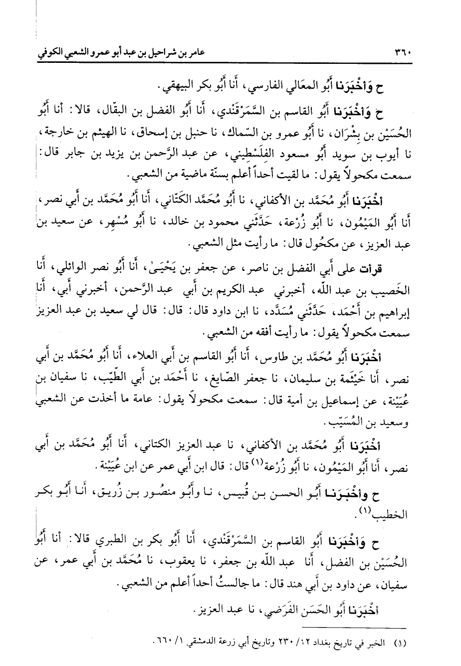 ح وأخبرنا أبو المعالي الفارسي أنا أبو بكر البيهقي ح وأخبرنا أبو القاسم بن السمرقندي أنا أبو الفضل بن البقال قالا أنا أبو الحسين بن بشران نا أبو عمرو بن السماك نا حنبل بن إسحاق نا الهيثم بن خارجة نا أيوب بن سويد أبو مسعود الفلسطيني عن عبد الرحمن بن يزيد بن جابر قال سمعت مكحولا يقول ما لقيت أحدا أعلم بسنة ماضية من الشعبي أخبرنا أبو محمد بن الأكفاني نا أبو محمد الكتاني أنا أبو محمد بن أبي نصر أنا أبو الميمون نا أبو زرعة حدثني محمود بن خالد نا أبو مسهر عن سعيد بن عبد العزيز عن مكحول قال ما رأيت مثل الشعبي قرأت على أبي الفضل بن ناصر عن جعفر بن يحيى أنا أبو نصر الوائلي أنا الخصيب بن عبد الله أخبرني عبد الكريم بن أبي عبد الرحمن أخبرني أبي أنا إبراهيم بن أحمد حدثني مسدد نا ابن داود قال قال لي سعيد بن عبد العزيز سمعت مكحولا يقول ما رأيت أفقه من الشعبي أخبرنا أبو محمد بن طاوس أنا أبو القاسم بن أبي العلاء أنا أبو محمد بن أبي نصر أنا خيثمة بن سليمان نا جعفر الصايغ نا أحمد بن أبي الطيب نا سفيان بن عيينة عن إسماعيل بن أمية قال سمعت مكحولا يقول عامة ما أخذت عن الشعبي وسعيد بن المسيب أخبرنا أبو محمد بن الأكفاني نا عبد العزيز الكتاني أنا أبو محمد بن أبي نصر أنا أبو الميمون نا أبو زرعة (1) قال قال ابن أبي عمر عن ابن عيينة ح وأخبرنا أبو الحسن بن قبيس نا وأبو منصور بن زريق أنا أبو بكر الخطيب (1) ح وأخبرنا أبو القاسم بن السمرقندي أنا أبو بكر بن الطبري قالا أنا أبو الحسين بن الفضل أنا عبد الله بن جعفر نا يعقوب نا محمد بن أبي عمر عن سفيان عن داود بن أبي هند قال ما جالست أحدا أعلم من الشعبي أخبرنا أبو الحسن الفرضي نا عبد العزيز