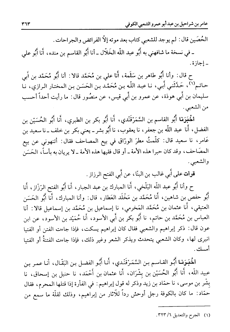 الحصين قال لم يوجد للشعبي كتاب بعد موته إلا الفرائض والجراحات في نسخة ما شافهني به أبو عبد الله الخلال أنا أبو القاسم بن منده أنا أبو علي إجازة ح قال وأنا أبو طاهر بن سلمة أنا علي بن محمد قالا أنا أبو محمد بن أبي حاتم (1) حدثني أبي نا عبد الله بن محمد بن الحسن بن المختار الرازي نا سليمان بن أبي هوذة عن عمرو بن أبي قيس عن منصور قال ما رأيت أحدا أحسب من الشعبي أخبرنا أبو القاسم بن السمرقندي أنا أبو بكر بن الطبري أنا أبو الحسين بن الفضل أنا عبد الله بن جعفر نا يعقوب نا أبو بشر يعني بكر بن خلف نا سعيد بن عامر نا سعيد قال كلمت مطر الوراق في بيع المصاحف فقال أتنهوني عن بيع المصاحف وقد كان حبرا هذه الأمة أو قال فقيها هذه الأمة لا يريان به بأسا الحسن والشعبي قرأت على أبي غالب بن البنا عن أبي الفتح الرزاز ح وأنا أبو عبد الله البلخي أنا المبارك بن عبد الجبار أنا أبو الفتح الرزاز أنا أبو حفص بن شاهين أنا محمد بن مخلد العطار قال وأنا المبارك أنا أبو الحسن العتيقي أنا عثمان بن محمد المخرمي نا إسماعيل بن محمد بن إسماعيل قالا أنا العباس بن محمد بن حاتم نا أبو بكر بن أبي الأسود أنا حميد بن الأسود عن ابن عون قال ذكر إبراهيم والشعبي فقال كان إبراهيم يسكت فإذا جاءت الفتن أو الفتيا انبرى لها وكان الشعبي يتحدث ويذكر الشعر وغير ذلك فإذا جاءت الفتنة أو الفتيا أمسك أخبرنا أبو القاسم بن السمرقندي أنا أبو الفضل بن البقال أنا عمر بن عبيد الله أنا أبو الحسين بن بشران أنا عثمان بن أحمد نا حنبل بن إسحاق نا بشر بن موسى نا حماد بن زيد وذكر له قول إبراهيم في الفأرة إذا قتلها المحرم فقال حماد ما كان بالكوفة رجل أوحش ردا للآثار من إبراهيم وذلك لقلة ما سمع من