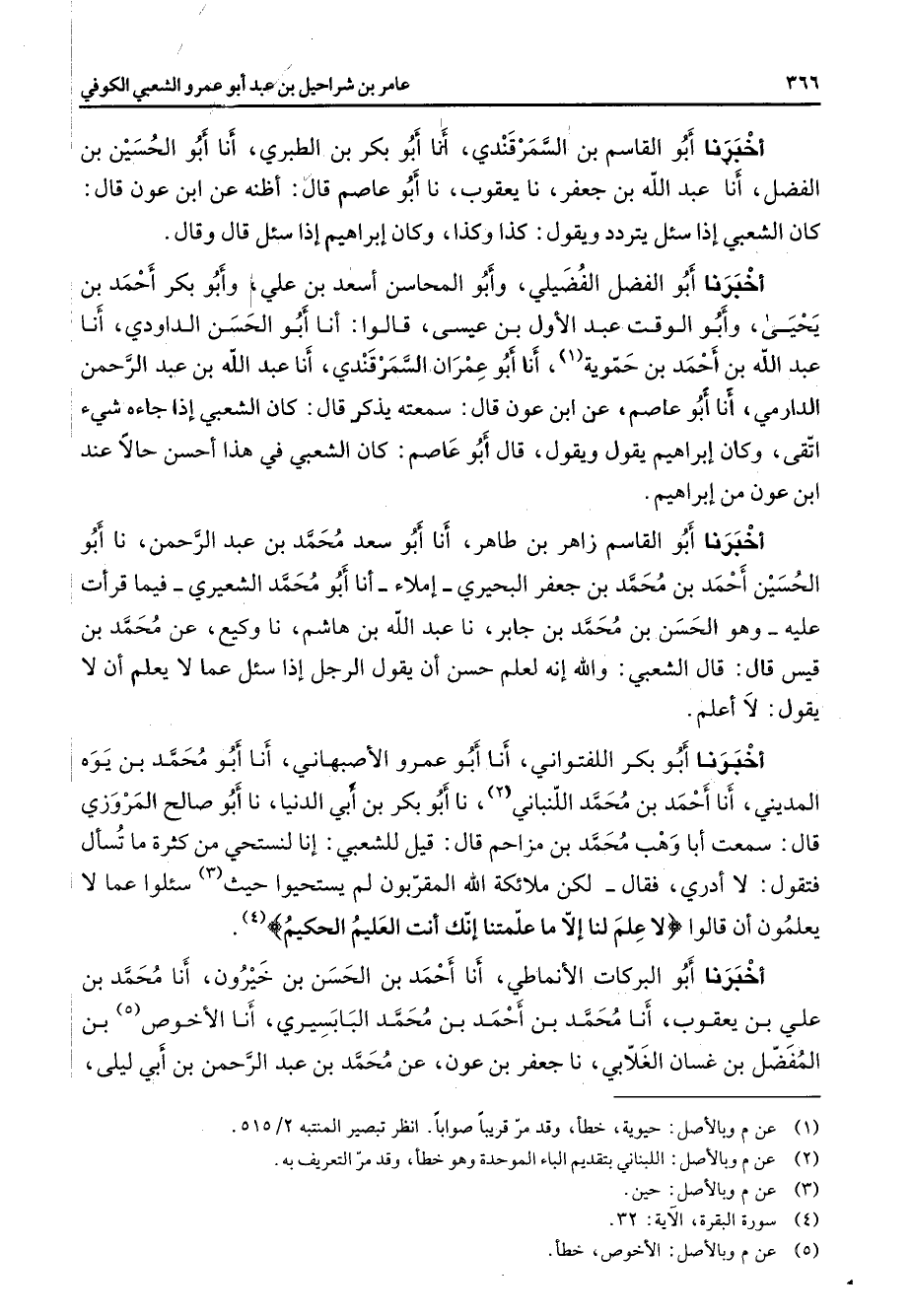 أخبرنا أبو القاسم بن السمرقندي أنا أبو بكر بن الطبري أنا أبو الحسين بن الفضل أنا عبد الله بن جعفر نا يعقوب نا أبو عاصم قال أظنه عن ابن عون قال كان الشعبي إذا سئل يتردد ويقول كذا وكذا وكان إبراهيم إذا سئل قال وقال أخبرنا أبو الفضل الفضيلي وأبو المحاسن أسعد بن علي وأبو بكر أحمد بن يحيى وأبو الوقت عبد الأول بن عيسى قالوا أنا أبو الحسن الداودي أنا عبد الله بن أحمد بن حموية (1) أنا أبو عمران السمرقندي أنا عبد الله بن عبد الرحمن الدارمي أنا أبو عاصم عن ابن عون قال سمعته يذكر قال كان الشعبي إذا جاءه شئ اتقى وكان إبراهيم يقول ويقول قال أبو عاصم كان الشعبي في هذا أحسن حالا عند ابن عون من إبراهيم أخبرنا أبو القاسم زاهر بن طاهر أنا أبو سعد محمد بن عبد الرحمن نا أبو الحسين أحمد بن محمد بن جعفر البحيري إملاء أنا أبو محمد الشعيري فيما قرأت عليه وهو الحسن بن محمد بن جابر نا عبد الله بن هاشم نا وكيع عن محمد بن قيس قال قال الشعبي والله إنه لعلم حسن أن يقول الرجل إذا سئل عما لا يعلم أن لا يقول لا أعلم أخبرنا أبو بكر اللفتواني أنا أبو عمرو الأصبهاني أنا أبو محمد بن يوه المديني أنا أحمد بن محمد اللنباني (2) نا أبو بكر بن أبي الدنيا نا أبو صالح المروزي قال سمعت أبا وهب محمد بن مزاحم قال قيل للشعبي إنا لنستحي من كثرة ما تسأل فتقول لا أدري فقال لكن ملائكة الله المقربون لم يستحيوا حيث (3) سئلوا عما لا يعلمون أن قالوا " لا علم لنا إلا ما علمتنا إنك أنت العليم الحكيم " (4) أخبرنا أبو البركات الأنماطي أنا أحمد بن الحسن بن خيرون أنا محمد بن علي بن يعقوب أنا محمد بن أحمد بن محمد البابسيري أنا الأخوص (5) بن المفضل بن غسان الغلابي نا جعفر بن عون عن محمد بن عبد الرحمن بن أبي ليلى