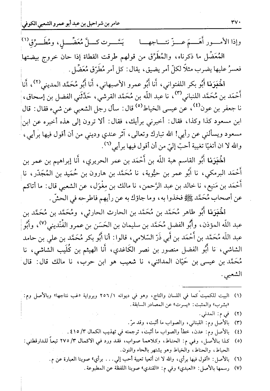 * وإذا الأمور أهم عز نتاجها * يسرت كل معضل ومطرق (1) * المعضل ما ذكرناه والمطرق من قولهم طرقت القطاة إذا حان خروج بيضتها فعسر عليها يضرب مثلا لكل أمر يضيق يقال كل أمر مطرق معضل أخبرنا أبو بكر اللفتواني أنا أبو عمرو الأصبهاني أنا أبو محمد المديني (2) أنا أحمد بن محمد اللنباني (3) نا عبد الله بن محمد القرشي حدثني الفضل بن إسحاق نا جعفر بن عون (4) عن عيسى الخياط (5) قال سأل رجل الشعبي عن شئ فقال قال ابن مسعود كذا وكذا فقال أخبرني برأيك فقال ألا ترون إلى هذه أخبره عن ابن مسعود ويسألني عن رأيي الله تبارك وتعالى آثر عندي وديني من أن أقول فيها برأيي والله لا أن أتغيا تغيية أحب إلي من أن أقول فيها برأيي (6) أخبرنا أبو القاسم هبة الله بن أحمد بن عمر الحريري أنا إبراهيم بن عمر بن أحمد البرمكي نا أبو عمر بن حيوية نا محمد بن هارون بن حميد بن المجدر نا أحمد بن منيع نا خالد بن عبد الرحمن نا مالك بن مغول عن الشعبي قال ما أتاكم عن أصحاب محمد (صلى الله عليه وسلم) فخذوا به وما جاؤك به عن رأيهم فاطرحه في الحش أخبرنا أبو طاهر محمد بن محمد بن الحارث الحارثي ومحمد بن محمد بن عبد الله المؤذن وأبو الفضل محمد بن سليمان بن الحسن بن عمرو الفنديني (7) وأبو عبد الله محمد بن أحمد بن أبي ذر السلامي قالوا أنا أبو بكر محمد بن علي بن حامد الشاشي نا أبو الفضل منصور بن نصر الكاغدي أنا الهيثم بن كليب الشاشي نا محمد بن عيسى بن حيان المدائني نا شعيب هو ابن حرب نا مالك قال قال الشعبي
