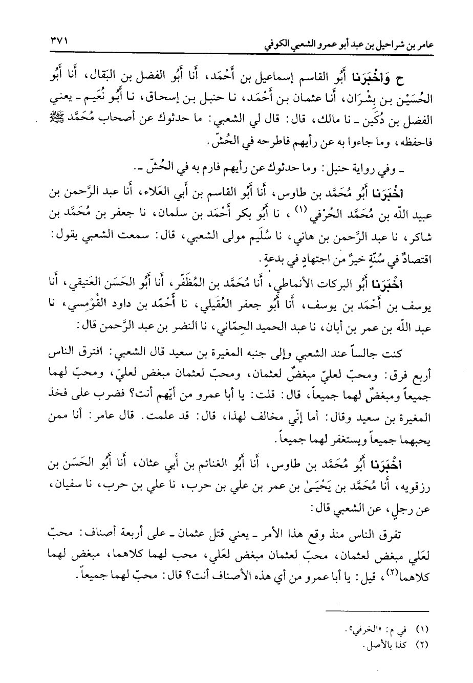 ح وأخبرنا أبو القاسم إسماعيل بن أحمد بن أحمد أنا أبو الفضل بن البقال أنا أبو الحسين بن بشران أنا عثمان بن أحمد نا حنبل بن إسحاق نا أبو نعيم يعني الفضل بن دكين نا مالك قال قال لي الشعبي ما حدثوك عن أصحاب محمد (صلى الله عليه وسلم) فاحفظه وما جاءوا به عن رأيهم فاطرحه في الحش وفي رواية حنبل وما حدثوك عن رأيهم فارم به في الحش أخبرنا أبو محمد بن طاوس أنا أبو القاسم بن أبي العلاء أنا عبد الرحمن بن عبيد الله بن محمد الحرفي (1) نا أبو بكر أحمد بن سلمان نا جعفر بن محمد بن شاكر نا عبد الرحمن بن هاني نا سليم مولى الشعبي قال سمعت الشعبي يقول اقتصاد في سنة خير من اجتهاد في بدعة أخبرنا أبو البركات الأنماطي أنا محمد بن المظفر أنا أبو الحسن العتيقي أنا يوسف بن أحمد بن يوسف أنا أبو جعفر العقيلي نا أحمد بن داود القومسي نا عبد الله بن عمر بن أبان نا عبد الحميد الحماني نا النضر بن عبد الرحمن قال كنت جالسا عند الشعبي وإلى جنبه المغيرة بن سعيد قال الشعبي افترق الناس أربع فرق ومحب لعلي مبغض لعثمان ومحب لعثمان مبغض لعلي ومحب لهما جميعا ومبغض لهما جميعا قال قلت يا أبا عمرو من أيهم أنت فضرب على فخذ المغيرة بن سعيد وقال أما إني مخالف لهذا قال قد علمت قال عامر أنا ممن يحبهما جميعا ويستغفر لهما جميعا أخبرنا أبو محمد بن طاوس أنا أبو الغنائم بن أبي عثان أنا أبو الحسن بن رزقويه أنا محمد بن يحيى بن عمر بن علي بن حرب نا علي بن حرب نا سفيان عن رجل عن الشعبي قال تفرق الناس منذ وقع هذا الأمر يعني قتل عثمان على أربعة أصناف محب لعلي مبغض لعثمان محب لعثمان مبغض لعلي محب لهما كلاهما مبغض لهما كلاهما (2) قيل يا أبا عمرو من أي هذه الأصناف أنت قال محب لهما جميعا