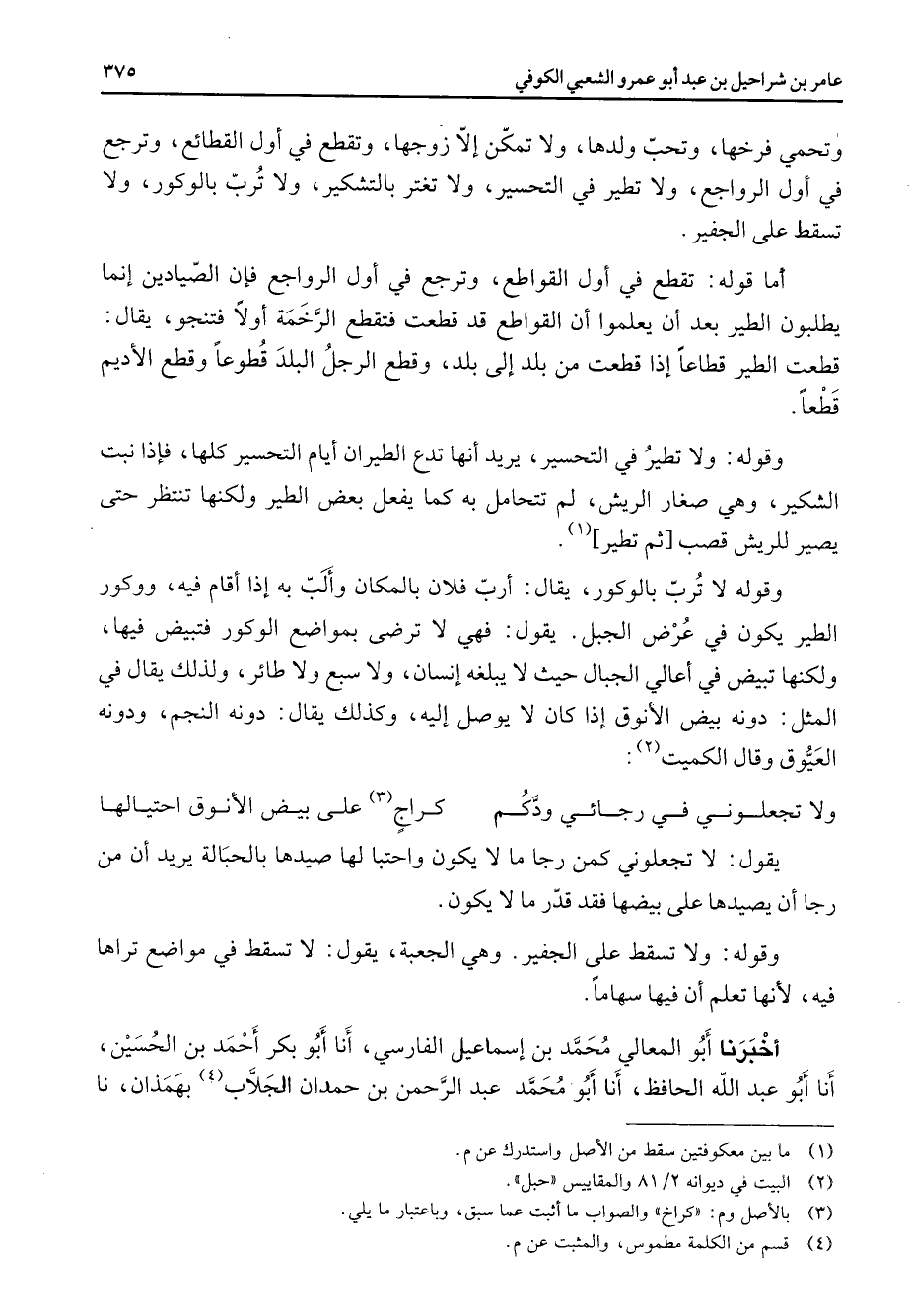 وتحمي فرخها وتحب ولدها ولا تمكن إلا زوجها وتقطع في أول القطائع وترجع في أول الرواجع ولا تطير في التحسير ولا تغتر بالتشكير ولا ترب بالوكور ولا تسقط على الجفير أما قوله تقطع في أول القواطع وترجع في أول الرواجع فإن الصيادين إنما يطلبون الطير بعد أن يعلموا أن القواطع قد قطعت فتقطع الرخمة أولا فتنجو يقال قطعت الطير قطاعا إذا قطعت من بلد إلى بلد وقطع الرجل البلد قطوعا وقطع الأديم قطعا وقوله ولا تطير في التحسير يريد أنها تدع الطيران أيام التحسير كلها فإذا نبت الشكير وهي صغار الريش لم تتحامل به كما يفعل بعض الطير ولكنها تنتظر حتى يصير للريش قصب ثم تطير (1) وقوله لا ترب بالوكور يقال أرب فلان بالمكان وألب به إذا أقام فيه ووكور الطير يكون في عرض الجبل يقول فهي لا ترضى بمواضع الوكور فتبيض فيها ولكنها تبيض في أعالي الجبال حيث لا يبلغه إنسان ولا سبع ولا طائر ولذلك يقال في المثل دونه بيض الأنوق إذا كان لا يوصل إليه وكذلك يقال دونه النجم ودونه العيوق وقال الكميت (2) * ولا تجعلوني في رجائي ودكم * كراج (3) على بيض الأنوق احتيالها * يقول لا تجعلوني كمن رجا ما لا يكون واحتبا لها صيدها بالحبالة يريد أن من رجا أن يصيدها على بيضها فقد قدر ما لا يكون وقوله ولا تسقط على الجفير وهي الجعبة يقول لا تسقط في مواضع تراها فيه لأنها تعلم أن فيها سهاما أخبرنا أبو المعالي محمد بن إسماعيل الفارسي أنا أبو بكر أحمد بن الحسين أنا أبو عبد الله الحافظ أنا أبو محمد عبد الرحمن بن حمدان الجلاب (4) بهمذان نا