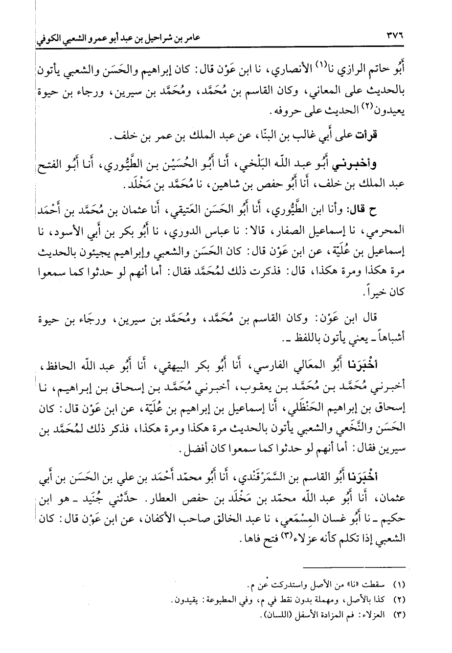 أبو حاتم الرازي نا (1) الأنصاري نا ابن عون قال كان إبراهيم والحسن والشعبي ياتون بالحديث على المعاني وكان القاسم بن محمد ومحمد بن سيرين ورجاء بن حيوة يعيدون (2) الحديث على حروفه قرأت على أبي غالب بن البنا عن عبد الملك بن عمر بن خلف وأخبرني أبو عبد الله البلخي أنا أبو الحسين بن الطيوري أنا أبو الفتح عبد الملك بن خلف أنا أبو حفص بن شاهين نا محمد بن مخلد ح قال وأنا ابن الطيوري أنا أبو الحسن العتيقي أنا عثمان بن محمد بن أحمد المحرمي نا إسماعيل الصفار قالا نا عباس الدوري نا أبو بكر بن أبي الأسود نا إسماعيل بن علية عن ابن عون قال كان الحسن والشعبي وإبراهيم يجيئون بالحديث مرة هكذا ومرة هكذا قال فذكرت ذلك لمحمد فقال أما أنهم لو حدثوا كما سمعوا كان خيرا قال ابن عون وكان القاسم بن محمد ومحمد بن سيرين ورجاء بن حيوة أشباها يعني يأتون باللفظ أخبرنا أبو المعالي الفارسي أنا أبو بكر البيهقي أنا أبو عبد الله الحافظ أخبرني محمد بن محمد بن يعقوب أخبرني محمد بن إسحاق بن إبراهيم نا إسحاق بن إبراهيم الحنظلي أنا إسماعيل بن إبراهيم بن علية عن ابن عون قال كان الحسن والنخعي والشعبي يأتون بالحديث مرة هكذا ومرة هكذا فذكر ذلك لمحمد بن سيرين فقال أما أنهم لو حدثوا كما سمعوا كان أفضل أخبرنا أبو القاسم بن السمرقندي أنا أبو محمد أحمد بن علي بن الحسن بن أبي عثمان أنا أبو عبد الله محمد بن مخلد بن حفص العطار حدثني جنيد هو ابن حكيم نا أبو غسان المسمعي نا عبد الخالق صاحب الأكفان عن ابن عون قال كان الشعبي إذا تكلم كأنه عزلاء (3) فتح فاها