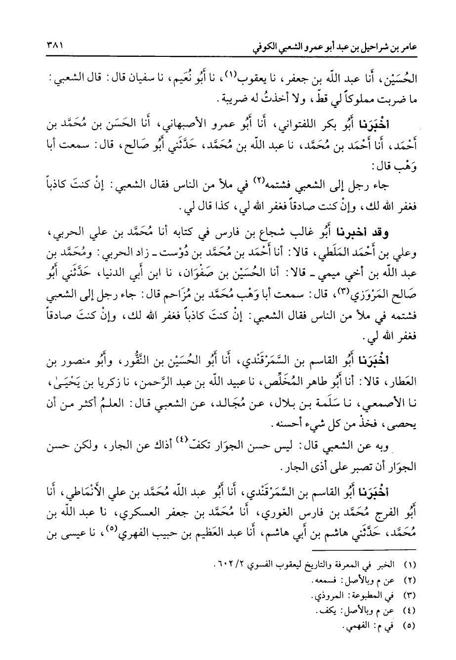 الحسين أنا عبد الله بن جعفر نا يعقوب (1) نا أبو نعيم نا سفيان قال قال الشعبي ما ضربت مملوكا لي قط ولا أخذت له ضريبة أخبرنا أبو بكر اللفتواني أنا أبو عمرو الأصبهاني أنا الحسن بن محمد بن أحمد أنا أحمد بن محمد نا عبد الله بن محمد حدثني أبو صالح قال سمعت أبا وهب قال جاء رجل إلى الشعبي فشتمه (2) في ملأ من الناس فقال الشعبي إن كنت كاذبا فغفر الله لك وإن كنت صادقا فغفر الله لي كذا قال لي وقد أخبرنا أبو غالب شجاع بن فارس في كتابه أنا محمد بن علي الحربي وعلي بن أحمد الملطي قالا أنا أحمد بن محمد بن دوست زاد الحربي ومحمد بن عبد الله بن أخي ميمي قالا أنا الحسين بن صفوان نا ابن أبي الدنيا حدثني أبو صالح المروزي (3) قال سمعت أبا وهب محمد بن مزاحم قال جاء رجل إلى الشعبي فشتمه في ملأ من الناس فقال الشعبي إن كنت كاذبا فغفر الله لك وإن كنت صادقا فغفر الله لي أخبرنا أبو القاسم بن السمرقندي أنا أبو الحسين بن النقور وأبو منصور بن العطار قالا أنا أبو طاهر المخلص نا عبيد الله بن عبد الرحمن نا زكريا بن يحيى نا الأصمعي نا سلمة بن بلال عن مجالد عن الشعبي قال العلم أكثر من أن يحصى فخذ من كل شئ أحسنه وبه عن الشعبي قال ليس حسن الجوار تكف (4) أذاك عن الجار ولكن حسن الجوار أن تصبر على أذى الجار أخبرنا أبو القاسم بن السمرقندي أنا أبو عبد الله محمد بن علي الأنماطي أنا أبو الفرج محمد بن فارس الغوري أنا محمد بن جعفر العسكري نا عبد الله بن محمد حدثني هاشم بن أبي هاشم أنا عبد العظيم بن حبيب الفهري (5) نا عيسى بن
