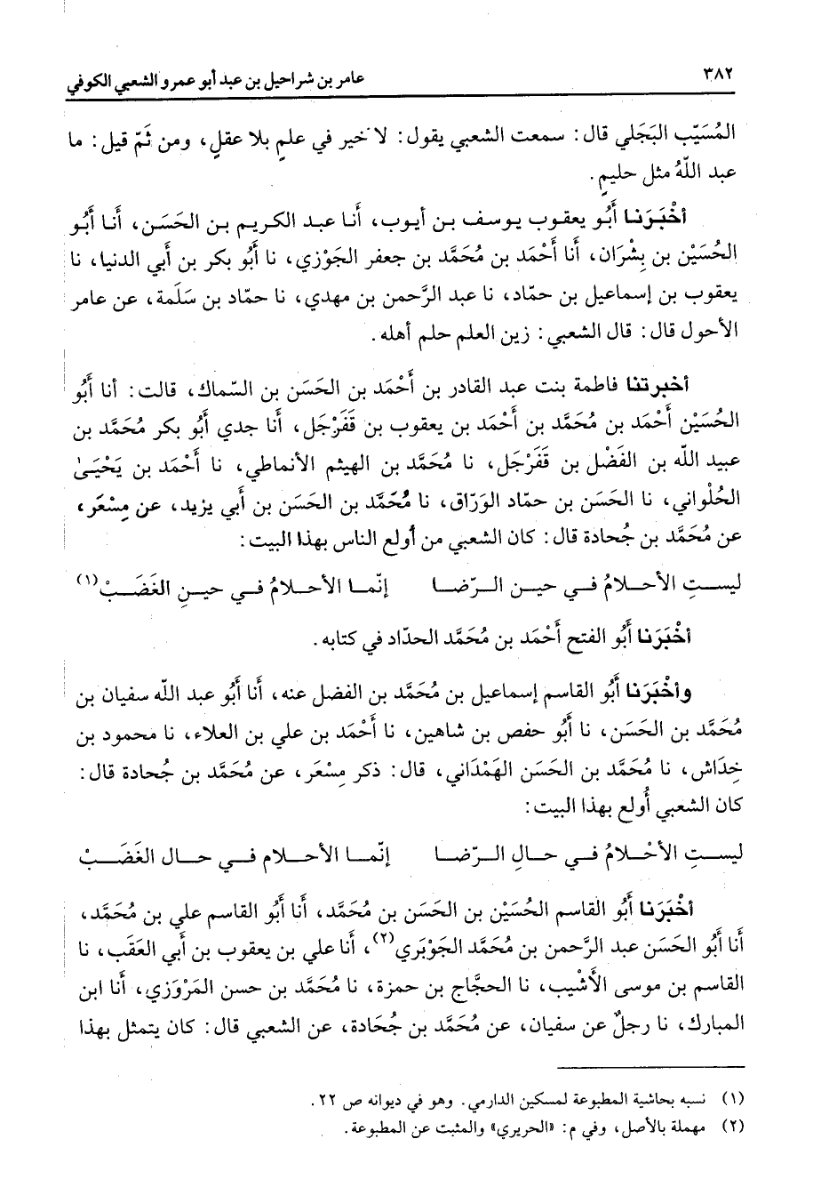 المسيب البجلي قال سمعت الشعبي يقول لا خير في علم بلا عقل ومن ثم قيل ما عبد الله مثل حليم أخبرنا أبو يعقوب يوسف بن أيوب أنا عبد الكريم بن الحسن أنا أبو الحسين بن بشران أنا أحمد بن محمد بن جعفر الجوزي نا أبو بكر بن أبي الدنيا نا يعقوب بن إسماعيل بن حماد نا عبد الرحمن بن مهدي نا حماد بن سلمة عن عامر الأحول قال قال الشعبي زين العلم حلم أهله أخبرتنا فاطمة بنت عبد القادر بن أحمد بن الحسن بن السماك قالت أنا أبو الحسين أحمد بن محمد بن أحمد بن يعقوب بن قفرجل أنا جدي أبو بكر محمد بن عبيد الله بن الفضل بن قفرجل نا محمد بن الهيثم الأنماطي نا أحمد بن يحيى الحلواني نا الحسن بن حماد الوراق نا محمد بن الحسن بن أبي يزيد عن مسعر عن محمد بن جحادة قال كان الشعبي من أولع الناس بهذا البيت * ليست الأحلام في حين الرضا * إنما الأحلام في حين الغضب (1) * أخبرنا أبو الفتح أحمد بن محمد الحداد في كتابه وأخبرنا أبو القاسم إسماعيل بن محمد بن الفضل عنه أنا أبو عبد الله سفيان بن محمد بن الحسن نا أبو حفص بن شاهين نا أحمد بن علي بن العلاء نا محمود بن خداش نا محمد بن الحسن الهمداني قال ذكر مسعر عن محمد بن جحادة قال كان الشعبي أولع بهذا البيت * ليست الأحلام في حال الرضا * إنما الأحلام في حال الغضب * أخبرنا أبو القاسم الحسين بن الحسن بن محمد أنا أبو القاسم علي بن محمد أنا أبو الحسن عبد الرحمن بن محمد الجوبري (2) أنا علي بن يعقوب بن أبي العقب نا القاسم بن موسى الأشيب نا الحجاج بن حمزة نا محمد بن حسن المروزي أنا ابن المبارك نا رجل عن سفيان عن محمد بن جحادة عن الشعبي قال كان يتمثل بهذا