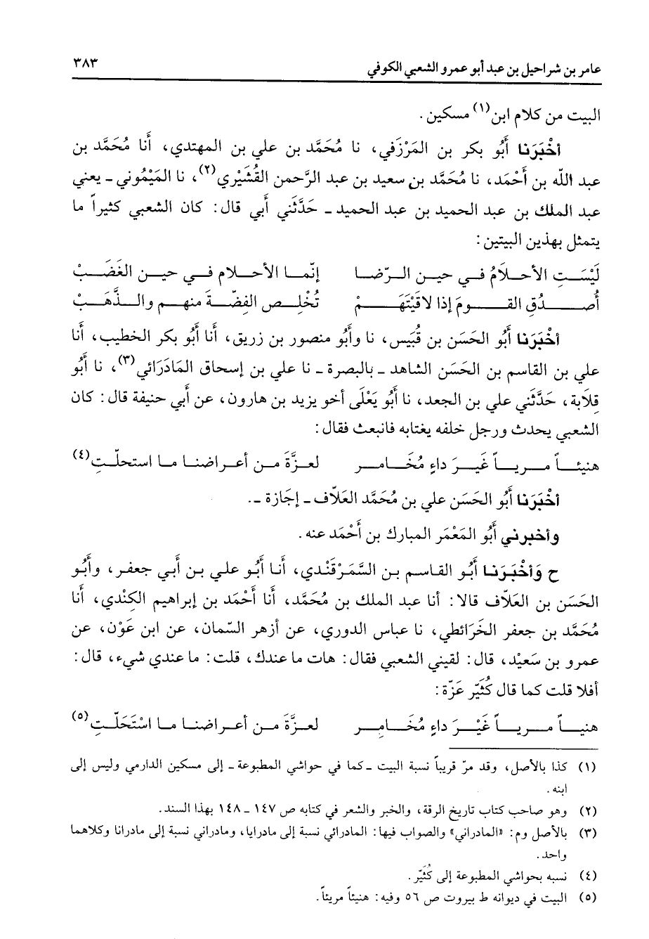 البيت من كلام ابن (1) مسكين أخبرنا أبو بكر بن المرزفي نا محمد بن علي بن المهتدي أنا محمد بن عبد الله بن أحمد نا محمد بن سعيد بن عبد الرحمن القشيري (2) نا الميموني يعني عبد الملك بن عبد الحميد بن عبد الحميد حدثني أبي قال كان الشعبي كثيرا ما يتمثل بهذين البيتين * ليست الأحلام في حين الرضا * إنما الأحلام في حين الغضب أصدق القوم إذا لاقيتهم * تخلص الفضة منهم والذهب * أخبرنا أبو الحسن بن قبيس نا وأبو منصور بن زريق أنا أبو بكر الخطيب أنا علي بن القاسم بن الحسن الشاهد بالبصرة نا علي بن إسحاق المادرائي (3) نا أبو قلابة حدثني علي بن الجعد نا أبو يعلى أخو يزيد بن هارون عن أبي حنيفة قال كان الشعبي يحدث ورجل خلفه يغتابه فانبعث فقال * هنيئا مريا غير داء مخامر * لعزة من أعراضنا ما استحلت (4) * أخبرنا أبو الحسن علي بن محمد العلاف إجازة وأخبرني أبو المعمر المبارك بن أحمد عنه ح وأخبرنا أبو القاسم بن السمرقندي أنا أبو علي بن أبي جعفر وأبو الحسن بن العلاف قالا أنا عبد الملك بن محمد أنا أحمد بن إبراهيم الكندي أنا محمد بن جعفر الخرائطي نا عباس الدوري عن أزهر السمان عن ابن عون عن عمرو بن سعيد قال لقيني الشعبي فقال هات ما عندك قلت ما عندي شئ قال أفلا قلت كما قال كثير عزة * هنيا مريا غير داء مخامر * لعزة من أعراضنا ما استحلت (5) *