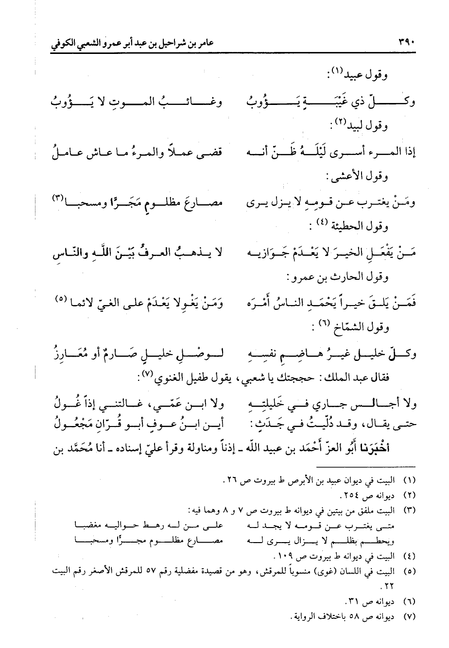وقول عبيد (1) * وكل ذي غيبة يؤوب * وغائب الموت لا يؤوب * وقول لبيد (2) * إذا المرء أسرى ليله ظن أنه * قضى عملا والمرء ما عاش عامل * وقول الأعشى * ومن يغترب عن قومه لا يزل يرى * مصارع مظلوم مجرا ومسحبا (3) * وقول الحطيئة (4) * من يفعل الخير لا يعدم جوازيه * لا يذهب العرف بين الله والناس * وقول الحارث بن عمرو * فمن يلق خيرا يحمد الناس أمره * ومن يغو لا يعدم على الغي لائما (5) * وقول الشماخ (6) * وكل خليل غير هاضم نفسه * لوصل خليل صارم أو معارز * فقال عبد الملك حججتك يا شعبي يقول طفيل الغنوي (7) * ولا أجالس جاري في خليلته * ولا ابن عمي غالتني إذا غول حتى يقال وقد دليت في جدث * أين ابن عوف أبو قران مجعول * أخبرنا أبو العز أحمد بن عبيد الله إذنا ومناولة وقرأ علي إسناده أنا محمد بن