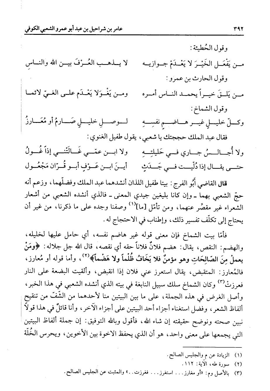 وقول الحطيئة * من يفعل الخير لا يعدم جوازيه * لا يذهب العرف بين الله والناس * وقول الحارث بن عمرو * من يلق خيرا يحمد الناس أمره * ومن يغولا يعدم على الغي لائما * وقول الشماخ * وكل خليل غير هاضم نفسه * لوصل خليل صارم أو معارز * فقال عبد الملك حججتك يا شعبي يقول طفيل الغنوي * ولا أجالس جاري في حليلته * ولا ابن عمي غالتني إذا غول حتى يقال إذا دليت في جدث * أين ابن عوف أبو قران مجعول * قال القاضي أبو الفرج بيتا طفيل اللذان أنشدهما عبد الملك وفضلهما وزعم أنه حج الشعبي بهما وإن كانا بليغين جيدي المعنى فالذي أنشده الشعبي من أشعار الشعراء غير مقصر عنهما ومن تأمل ما (1) وصفنا وجده على ما ذكرنا من غير أن يحتاج إلى تكلف تفسير ذلك وإطناب في الاحتجاج له فأما بيت الشماخ فإن معنى قوله غير هاضم نفسه أي حامل عليها لخليله والهضم النقص يقال هضم فلان فلانا حقه أي نقصه قال الله جل جلاله " ومن يعمل من الصالحات وهو مؤمن فلا يخاف ظلما ولا هضما " (2) وأما قوله أو معارز فالمعارز المتقبض يقال استعرز عني فلان إذا انقبض وألقيت البضعة على النار فعرزت (3) وكان الشماخ سلك سبيل النابغة في بيته الذي أنشده الشعبي في هذا الخبر وأصل الغرض في هذه الجملة على ما بين البيتين منا لأحدهما من الشف من تنقيح ألفاظ الشعر وفضل استغناء أجزاء أحد البيتين على أجزاء الآخر وأنا قائل في هذا قولا نبين صحته ونوضح حقيقته إن شاء الله فأقول وبالله التوفيق إن جملة ألفاظ البيتين التي يجمعها على معنى واحد هو أن الذي يحفظ الاخوة بين الأخوين ويحرس الخلة