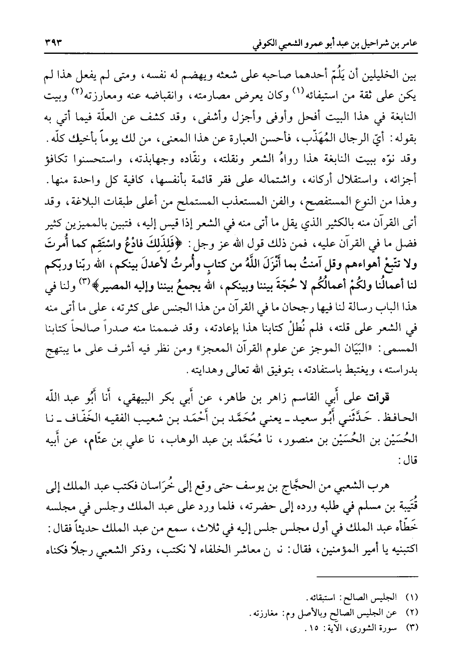 بين الخليلين أن يلم أحدهما صاحبه على شعثه ويهضم له نفسه ومتى لم يفعل هذا لم يكن على ثقة من استيفائه (1) وكان يعرض مصارمته وانقباضه عنه ومعازرته (2) وبيت النابغة في هذا البيت أفحل وأوفى وأجزل وأشفى وقد كشف عن العلة فيما أتي به بقوله أي الرجال المهذب فأحسن العبارة عن هذا المعنى من لك يوما بأخيك كله وقد نوه ببيت النابغة هذا رواه الشعر ونقلته ونقاده وجهابذته واستحسنوا تكافؤ أجزائه واستقلال أركانه واشتماله على فقر قائمة بأنفسها كافية كل واحدة منها وهذا من النوع المستفصح والفن المستعذب المستملح من أعلى طبقات البلاغة وقد أتى القرآن منه بالكثير الذي يقل ما أتى منه في الشعر إذا قيس إليه فتبين بالمميزين كثير فضل ما في القرآن عليه فمن ذلك قول الله عز وجل " فلذلك فادع واستقم كما أمرت ولا تتبع أهواءهم وقل آمنت بما أنزل الله من كتاب وأمرت لأعدل بينكم الله ربنا وربكم لنا أعمالنا ولكم أعمالكم لا حجة بيننا وبينكم الله يجمع بيننا وإليه المصير " (3) ولنا في هذا الباب رسالة لنا فيها رجحان ما في القرآن من هذا الجنس على كثرته على ما أتى منه في الشعر على قلته فلم نطل كتابنا هذا بإعادته وقد ضممنا منه صدرا صالحا كتابنا المسمى البيان الموجز عن علوم القرآن المعجز ومن نظر فيه أشرف على ما يبتهج بدراسته ويغتبط باستفادته بتوفيق الله تعالى وهدايته قرأت على أبي القاسم زاهر بن طاهر عن أبي بكر البيهقي أنا أبو عبد الله الحافظ حدثني أبو سعيد يعني محمد بن أحمد بن شعيب الفقيه الخفاف نا الحسين بن الحسين بن منصور نا محمد بن عبد الوهاب نا علي بن عثام عن أبيه قال هرب الشعبي من الحجاج بن يوسف حتى وقع إلى خراسان فكتب عبد الملك إلى قتيبة بن مسلم في طلبه ورده إلى حضرته فلما ورد على عبد الملك وجلس في مجلسه خطأه عبد الملك في أول مجلس جلس إليه في ثلاث سمع من عبد الملك حديثا فقال اكتبنيه يا أمير المؤمنين فقال نحن معشر الخلفاء لا نكتب وذكر الشعبي رجلا فكناه