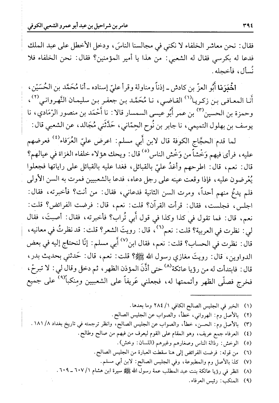 فقال نحن معشر الخلفاء لا نكني في مجالسنا الناس ودخل الأخطل على عبد الملك فدعا له بكرسي فقال له الشعبي من هذا يا أمير المؤمنين فقال نحن الخلفاء فلا نسأل فأخجله أخبرنا أبو العز بن كادش إذنا ومناولة وقرأ علي إسناده أنا محمد بن الحسين أنا المعافى بن زكريا (1) القاضي نا محمد بن جعفر بن سليمان النهرواني (2) وحمزة بن الحسين (3) بن عمر أبو عيسى السمسار قالا نا أحمد بن منصور الرمادي نا يوسف بن بهلول التميمي نا جابر بن نوح الحماني حدثني مجالد عن الشعبي قال لما قدم الحجاج الكوفة قال لابن أبي مسلم اعرض علي العرفاء (4) فعرضهم عليه فرأى فيهم وخشا من وخش الناس (5) قال ويحك هؤلاء خلفاء الغزاة في عيالهم قال نعم قال اطرحهم وأغد علي بالقبائل فغدا عليه بالقبائل على راياتها فجعلوا يعرضون عليه فإذا وقعت عينه على رجل دعاه فدعا بالشعبيين فمرت به السن الأولى فلم يدع منهم أحدا ومرت السن الثانية فدعاني فقال من أنت فأخبرته فقال اجلس فجلست فقال قرأت القرآن قلت نعم قال فرضت الفرائض قلت نعم قال فما تقول في كذا وكذا في قول أبي تراب فأخبرته فقال أصبت فقال لي نظرت في العربية قلت نعم (6) قال رويت الشعر قلت قد نظرت في معاينة قال نظرت في الحساب قلت نعمفقال ابن (7) أبي مسلم إنا لنحتاج إليه في بعض الدواوين قال رويت مغازي رسول الله (صلى الله عليه وسلم) قلت نعم قال حدثني بحديث بدر قال فابتدأت له من رؤيا عاتكة (8) حتى أذن المؤذن الظهر ثم دخل وقال لي لا تبرح فخرج فصلى الظهر وأتممتها له فجعلني عريفا على الشعبيين ومنكبا (9) على جميع