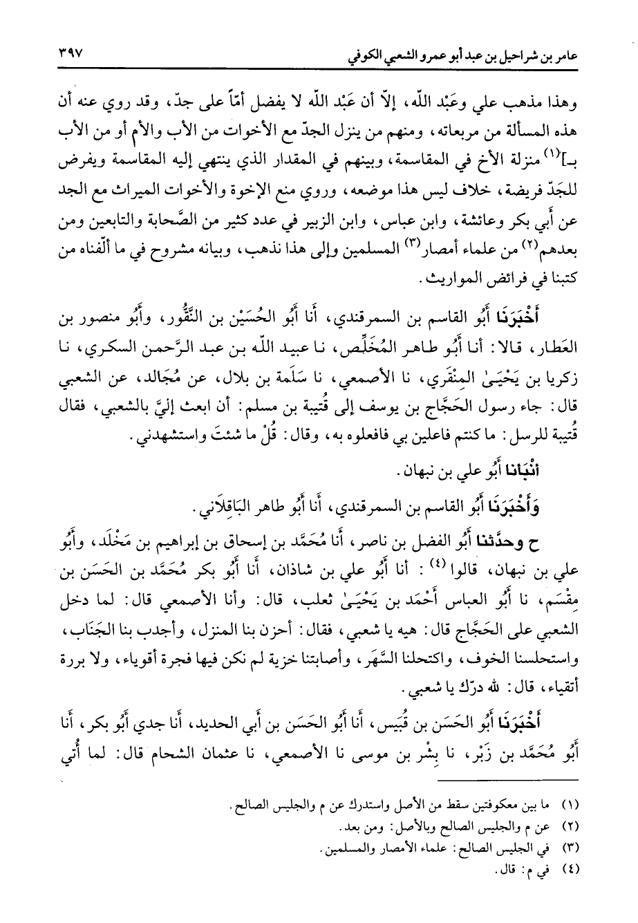 وهذا مذهب علي وعبد الله إلا أن عبد الله لا يفضل أما على جد وقد روي عنه أن هذه المسألة من مربعاته ومنهم من ينزل الجد مع الأخوات من الأب والأم أو من الأب ب] (1) منزلة الأخ في المقاسمة وبينهم في المقدار الذي ينتهي إليه المقاسمة ويفرض للجد فريضة خلاف ليس هذا موضعه وروي منع الإخوة والأخوات الميراث مع الجد عن أبي بكر وعائشة وابن عباس وابن الزبير في عدد كثير من الصحابة والتابعين ومن بعدهم (2) من علماء أمصار (3) المسلمين وإلى هذا نذهب وبيانه مشروح في ما ألفناه من كتبنا في فرائض المواريث أخبرنا أبو القاسم بن السمرقندي أنا أبو الحسين بن النقور وأبو منصور بن العطار قالا أنا أبو طاهر المخلص نا عبيد الله بن عبد الرحمن السكري نا زكريا بن يحيى المنقري نا الأصمعي نا سلمة بن بلال عن مجالد عن الشعبي قال جاء رسول الحجاج بن يوسف إلى قتيبة بن مسلم أن ابعث إلي بالشعبي فقال قتيبة للرسل ما كنتم فاعلين بي فافعلوه به وقال قل ما شئت واستشهدني أنبأنا أبو علي بن نبهان أخبرنا أبو القاسم بن السمرقندي أنا أبو طاهر الباقلاني ح وحدثنا أبو الفضل بن ناصر أنا محمد بن إسحاق بن إبراهيم بن مخلد وأبو علي بن نبهان قالوا (4) أنا أبو علي بن شاذان أنا أبو بكر محمد بن الحسن بن مقسم نا أبو العباس أحمد بن يحيى ثعلب قال وأنا الأصمعي قال لما دخل الشعبي على الحجاج قال هيه يا شعبي فقال أحزن بنا المنزل وأجدب بنا الجناب واستحلسنا الخوف واكتحلنا السهر وأصابتنا خزية لم نكن فيها فجرة أقوياء ولا بررة أتقياء قال لله درك يا شعبي أخبرنا أبو الحسن بن قبيس أنا أبو الحسن بن أبي الحديد أنا جدي أبو بكر أنا أبو محمد بن زبر نا بشر بن موسى نا الأصمعي نا عثمان الشحام قال لما أتي