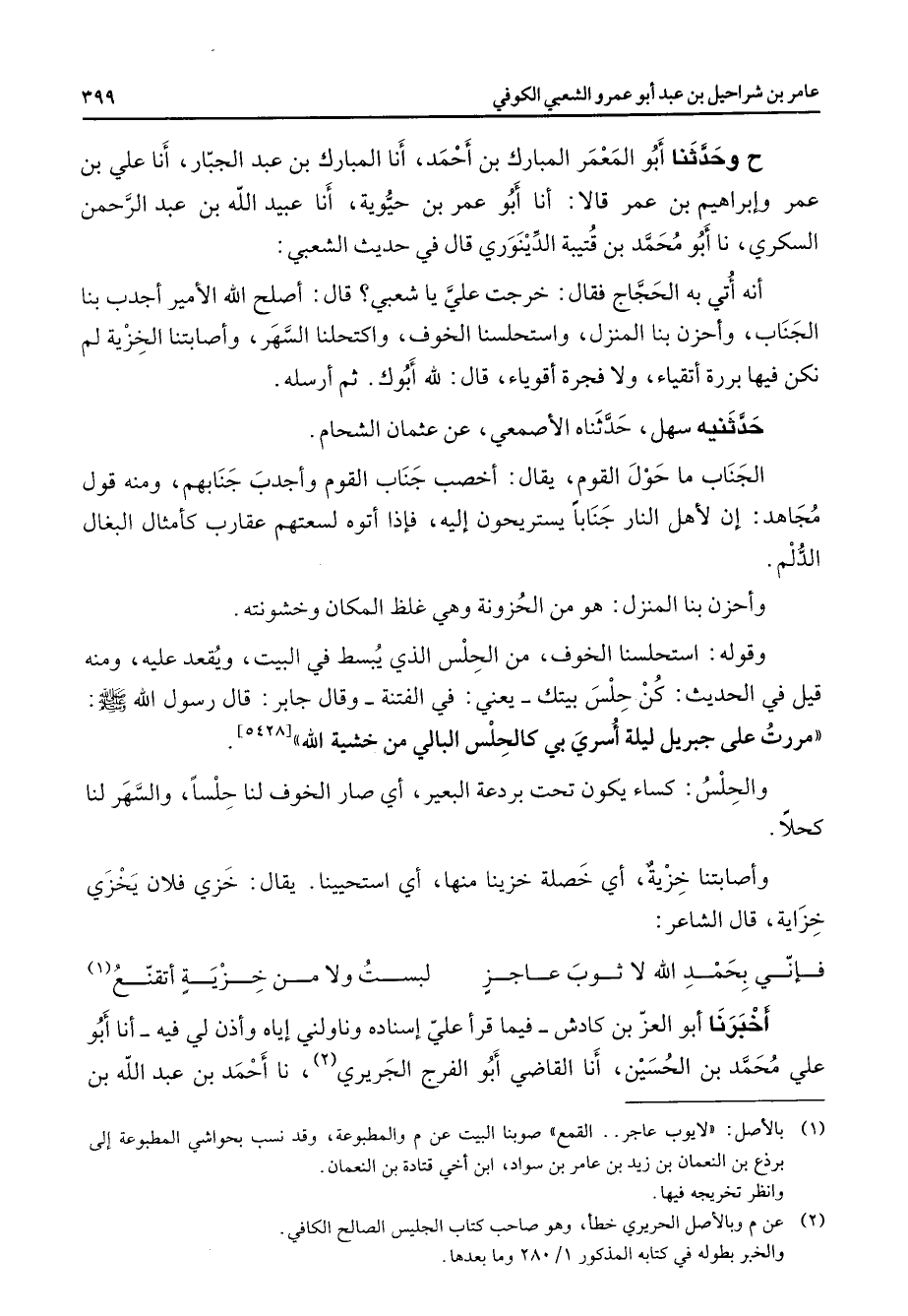 ح وحدثنا أبو المعمر المبارك بن أحمد أنا المبارك بن عبد الجبار أنا علي بن عمر وإبراهيم بن عمر قالا أنا أبو عمر بن حيوية أنا عبيد الله بن عبد الرحمن السكري نا أبو محمد بن قتيبة الدينوري قال في حديث الشعبي أنه أتي به الحجاج فقال خرجت علي يا شعبي قال أصلح الله الأمير أجدب بنا الجناب وأحزن بنا المنزل واستحلسنا الخوف واكتحلنا السهر وأصابتنا الخزية لم نكن فيها بررة أتقياء ولا فجرة أقوياء قال لله أبوك ثم أرسله حدثنيه سهل حدثناه الأصمعي عن عثمان الشحام الجناب ما حول القوم يقال أخصب جناب القوم وأجدب جنابهم ومنه قول مجاهد إن لأهل النار جنابا يستريحون إليه فإذا أتوه لسعتهم عقارب كأمثال البغال الدلم وأحزن بنا المنزل هو من الحزونة وهي غلظ المكان وخشونته وقوله استحلسنا الخوف من الحلس الذي يبسط في البيت ويقعد عليه ومنه قيل في الحديث كن حلس بيتك يعني في الفتنة وقال جابر قال رسول الله (صلى الله عليه وسلم) مررت على جبريل ليلة أسري بي كالحلس البالي من خشية الله والحلس كساء يكون تحت بردعة البعير أي صار الخوف لنا حلسا والسهر لنا كحلا واصابتنا خزية أي خصلة خزينا منها أي استحيينا يقال خزي فلان يخزي خزاية قال الشاعر * فإني بحمد الله لا ثوب عاجز * لبست ولا من خزية أتقنع (1) * أخبرنا أبو العز بن كادش فيما قرأ علي إسناده وناولني إياه وأذن لي فيه أنا أبو علي محمد بن الحسين أنا القاضي أبو الفرج الجريري (2) نا أحمد بن عبد الله بن