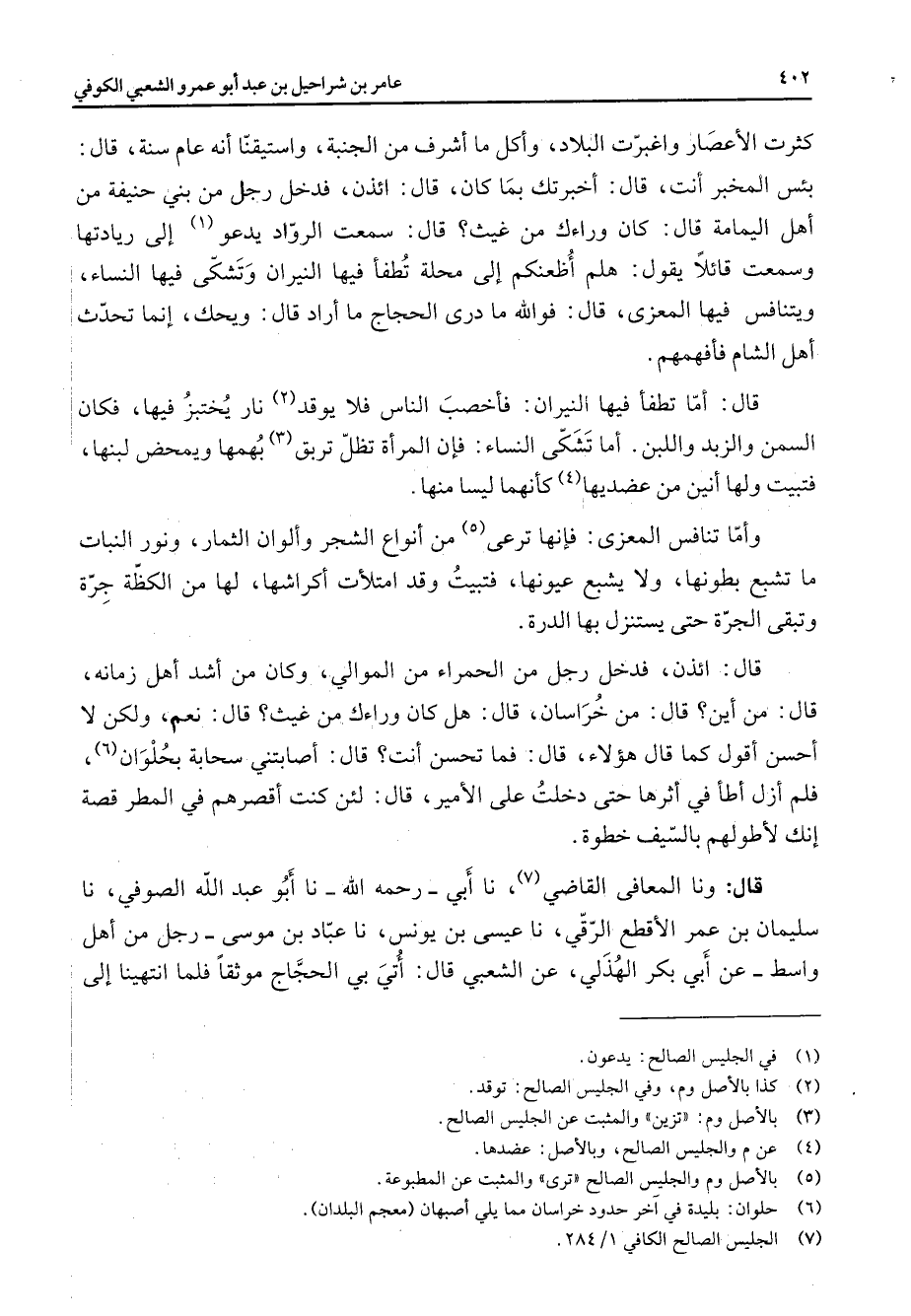 كثرت الأعصار واغبرت البلاد وأكل ما أشرف من الجنبة واستيقنا أنه عام سنة قال بئس المخبر أنت قال أخبرتك بما كان قال ائذن فدخل رجل من بني حنيفة من أهل اليمامة قال كان وراءك من غيث قال سمعت الرواد يدعو (1) إلى ريادتها وسمعت قائلا يقول هلم أظعنكم إلى محله تطفأ فيها النيران وتشكى فيها النساء ويتنافس فيها المعزى قال فو الله ما درى الحجاج ما أراد قال ويحك إنما تحدث أهل الشام فأفهمهم قال أما تطفأ فيها النيران فأخصب الناس فلا يوقد (2) نار يختبر فيها فكان السمن والزبد واللبن أما تشكى النساء فإن المرأة تظل تربق (3) بهمها ويمحض لبنها فتبيت ولها من عضديها (4) كأنهما ليسا منها وأما تنافس المعزى فإنها ترعى (5) من أنواع الشجر وألوان الثمار ونور النبات ما تشبع بطونها ولا يشبع عيونها فتبيت وقد امتلأت أكراشها لها من الكظة جرة وتبقى الجرة حتى يستنزل بها الدرة قال ائذن فدخل رجل من الحمراء من الموالي وكان من أشد أهل زمانه قال من أين قال من خراسان قال هل كان وراءك من غيث قال نعم ولكن لا أحسن أقول كما قال هؤلاء قال فما تحسن أنت قال أصابتني سحابة بحلوان (6) فلم أزل أطأ في أثرها حتى دخلت على الأمير قال لئن كنت أقصرهم في المطر قصة إنك لأطولهم بالسيف خطوة قال ونا المعافى القاضي (7) نا أبي رحمه الله نا أبو عبد الله الصوفي نا سليمان بن عمر الأقطع الرقي نا عيسى بن يونس نا عباد بن موسى رجل من أهل واسط عن أبي بكر الهذلي عن الشعبي قال أتي بي الحجاج موثقا فلما انتهينا إلى