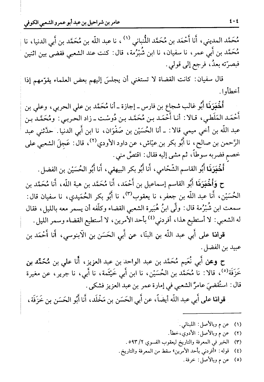 أخبرنا أبو غالب شجاع بن فارس إجازة أنا محمد بن علي الحربي وعلي بن أحمد الملطي قالا أنا أحمد بن محمد بن دوست زاد الحربي ومحمد بن عبد الله بن أخي ميمي قالا أنا الحسين بن صفوان نا ابن أبي الدنيا حدثني عبد الرحمن بن صالح نا أبو بكر بن عياش عن داود الأودي (2) قال عجل الشعبي على خصم فضربه سوطا ثم مشى إليه فقال اقتص مني أخبرنا أبو القاسم الشحامي أنا أبو بكر البيهقي أنا أبو الحسين بن الفضل ح وأخبرنا أبو القاسم إسماعيل بن أحمد أنا محمد بن هبة الله أنا محمد بن الحسين أنا عبد الله بن جعفر نا يعقوب (3) نا أبو بكر الحميدي نا سفيان قال سمعت ابن شبرمة قال ولى ابن هبيرة الشعبي القضاء وكلفه أن يسمر معه بالليل فقال له الشعبي لا أستطيع هذا أفردني (4) بأحد الأمرين لا أستطيع القضاء وسمر الليل قرأنا على أبي عبد الله بن البنا عن أبي الحسن بن الآبنوسي أنا أحمد بن عبيد بن الفضل
