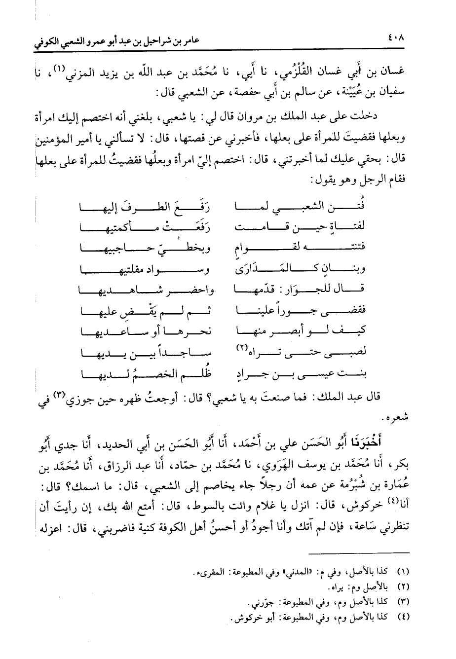 غسان بن أبي غسان القلزمي نا أبي نا محمد بن عبد الله بن يزيد المزني (1) نا سفيان بن عيينة عن سالم بن أبي حفصة عن الشعبي قال دخلت على عبد الملك بن مروان قال لي يا شعبي بلغني أنه اختصم إليك امرأة وبعلها فقضيت للمرأة على بعلها فأخبرني عن قصتها قال لا تسألني يا أمير المؤمنين قال بحقي عليك لما أخبرتني قال اختصم إلي امرأة وبعلها فقضيت للمرأة على بعلها فقام الرجل وهو يقول: * فتن الشعبي لما * رفع الطرف إليها لفتاة حين قامت * رفعت مأكمتيها فتنته لقوام * وبخطي حاجبيها وبنان كالمدارى * وسواد مقلتيها قال للجوار قدمها * واحضر شاهديها فقضى جورا علينا * ثم لم يقض عليها كيف لو أبصر منها * نحرها أو ساعديها لصبى حتى تراه (2) * ساجدا بين يديها بنت عيسى بن جراد * ظلم الخصم لديها * قال عبد الملك فما صنعت به يا شعبي قال أوجعت ظهره حين جوزي (3) في شعره أخبرنا أبو الحسن علي بن أحمد أنا أبو الحسن بن أبي الحديد أنا جدي أبو بكر أنا محمد بن يوسف الهروي نا محمد بن حماد أنا عبد الرزاق أنا محمد بن عمارة بن شبرمة عن عمه أن رجلا جاء يخاصم إلى الشعبي قال ما اسمك قال أنا (4) خركوش قال انزل يا غلام وائت بالسوط قال أمتع الله بك إن رأيت أن تنظرني ساعة فإن لم آتك وأنا أجود أو أحسن أهل الكوفة كنية فاضربني قال اعزله