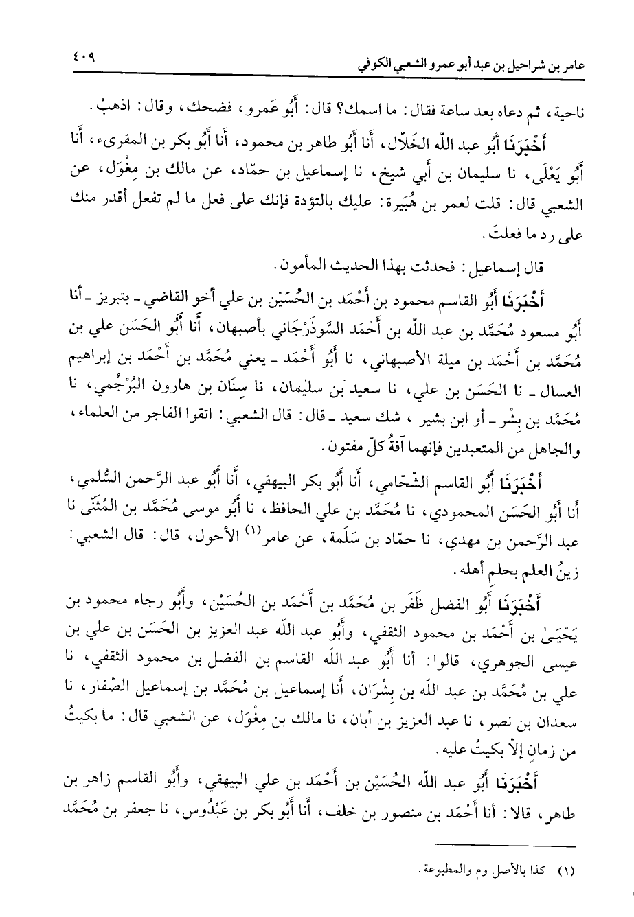 ناحية ثم دعاه بعد ساعة فقال ما اسمك قال أبو عمرو فضحك وقال اذهب أخبرنا أبو عبد الله الخلال أنا أبو طاهر بن محمود أنا أبو بكر بن المقرئ أنا أبو يعلى نا سليمان بن أبي شيخ نا إسماعيل بن حماد عن مالك بن مغول عن الشعبي قال قلت لعمر بن هبيرة عليك بالتؤدة فإنك على فعل ما لم تفعل أقدر منك على رد ما فعلت قال إسماعيل فحدثت بهذا الحديث المأمون أخبرنا أبو القاسم محمود بن أحمد بن الحسين بن علي أخو القاضي بتبريز أنا أبو مسعود محمد بن عبد الله بن أحمد السوذرجاني بأصبهان أنا أبو الحسن علي بن محمد بن أحمد بن ميلة الأصبهاني نا أبو أحمد يعني محمد بن أحمد بن إبراهيم العسال نا الحسن بن علي نا سعيد بن سليمان نا سنان بن هارون البرجمي نا محمد بن بشر أو ابن بشير شك سعيد قال قال الشعبي اتقوا الفاجر من العلماء والجاهل من المتعبدين فإنهما آفة كل مفتون أخبرنا أبو القاسم الشحامي أنا أبو بكر البيهقي أنا أبو عبد الرحمن السلمي أنا أبو الحسن المحمودي نا محمد بن علي الحافظ نا أبو موسى محمد بن المثنى نا عبد الرحمن بن مهدي نا حماد بن سلمة عن عامر (1) الأحول قال قال الشعبي زين العلم بحلم أهله أخبرنا أبو الفضل ظفر بن محمد بن أحمد بن الحسين وأبو رجاء محمود بن يحيى بن أحمد بن محمود الثقفي وأبو عبد الله عبد العزيز بن الحسن بن علي بن عيسى الجوهري قالوا أنا أبو عبد الله القاسم بن الفضل بن محمود الثقفي نا علي بن محمد بن عبد الله بن بشران أنا إسماعيل بن محمد بن إسماعيل الصفار نا سعدان بن نصر نا عبد العزيز بن أبان نا مالك بن مغول عن الشعبي قال ما بكيت من زمان إلا بكيت عليه أخبرنا أبو عبد الله الحسين بن أحمد بن أحمد بن علي البيهقي وأبو القاسم زاهر بن طاهر قالا أنا أحمد بن منصور بن خلف أنا أبو بكر بن عبدوس نا جعفر بن محمد