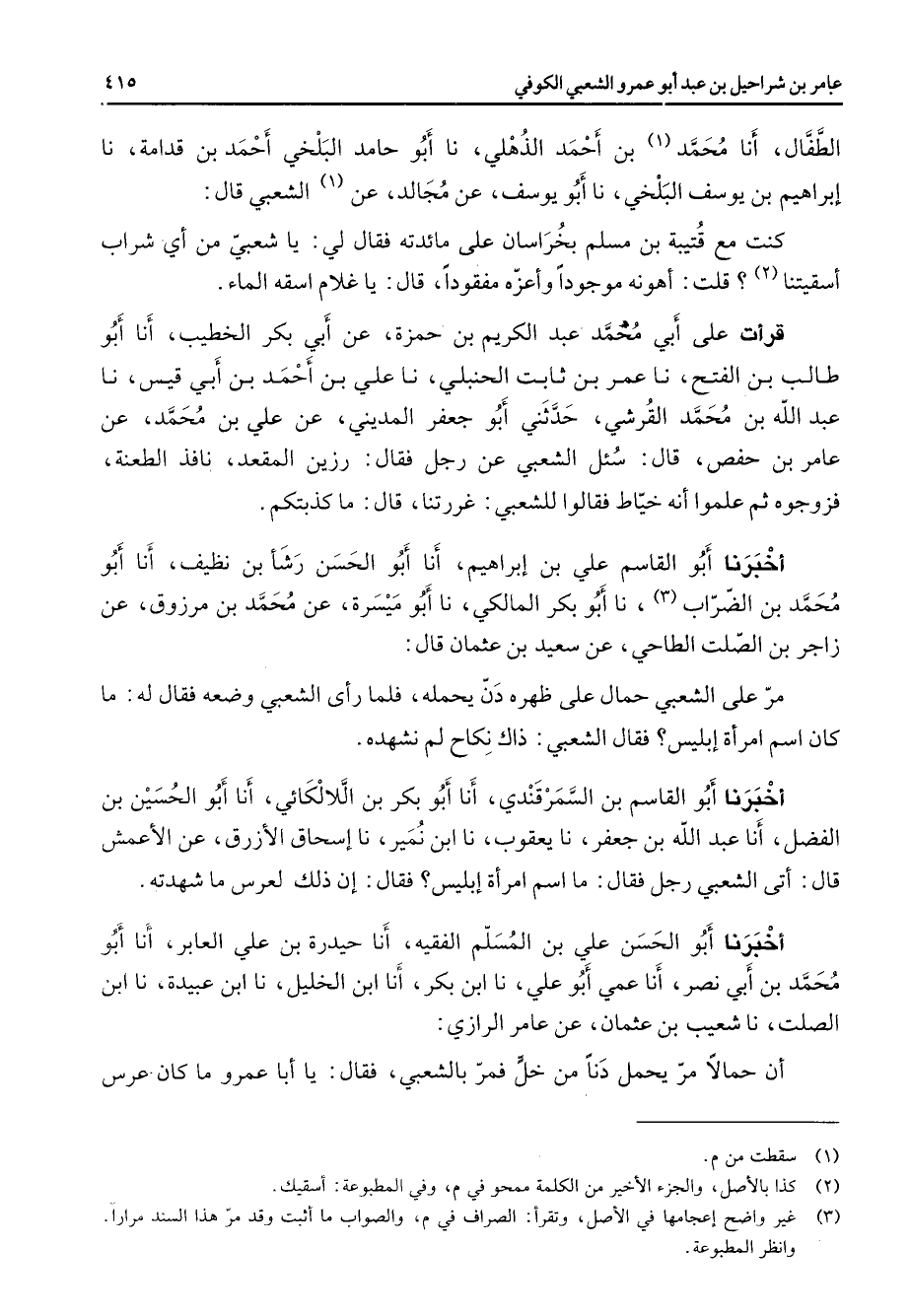 الطفال أنا محمد (1) بن أحمد الذهلي نا أبو حامد البلخي أحمد بن قدامة نا إبراهيم بن يوسف البلخي نا أبو يوسف عن مجالد عن (2) الشعبي قال كنت مع قتيبة بن مسلم بخراسان على مائدته فقال لي يا شعبي من أي شراب أسقيتنا (2) قلت أهونه موجودا وأعزه مفقودا قال يا غلام اسقه الماء قرأت على أبي محمد عبد الكريم بن حمزة عن أبي بكر الخطيب أنا أبو طالب بن الفتح نا عمر بن ثابت الحنبلي نا علي بن أحمد بن أبي قيس نا عبد الله بن محمد القرشي حدثني أبو جعفر المديني عن علي بن محمد عن عامر بن حفص قال سئل الشعبي عن رجل فقال رزين المقعد نافذ الطعنة فزوجوه ثم علموا أنه خياط فقالوا للشعبي غررتنا قال ما كذبتكم أخبرنا أبو القاسم علي بن إبراهيم أنا أبو الحسن رشأ بن نظيف أنا أبو محمد بن الضراب (3) نا أبو بكر المالكي نا أبو ميسرة عن محمد بن مرزوق عن زاجر بن الصلت الطالحي عن سعيد بن عثمان قال مر على الشعبي حمال على ظهره دن يحمله فلما رأى الشعبي وضعه فقال له ما كان اسم امرأة إبليس فقال الشعبي ذاك نكاح لم نشهده أخبرنا أبو القاسم بن السمرقندي أنا أبو بكر بن اللالكائي أنا أبو الحسين بن الفضل أنا عبد الله بن جعفر نا يعقوب نا ابن نمير نا إسحاق الأزرق عن الأعمش قال أتى الشعبي رجل فقال ما اسم امرأة إبليس فقال إن ذلك لعرس ما شهدته أخبرنا أبو الحسن علي بن المسلم الفقيه أنا حيدرة بن علي العابر أنا أبو محمد بن أبي نصر أنا عمي أبو علي نا ابن بكر أنا ابن الخليل نا ابن عبيدة نا ابن الصلت نا شعيب بن عثمان عن عامر الرازي أن حمالا مر يحمل دنا من خل فمر بالشعبي فقال يا أبا عمرو ما كان عرس