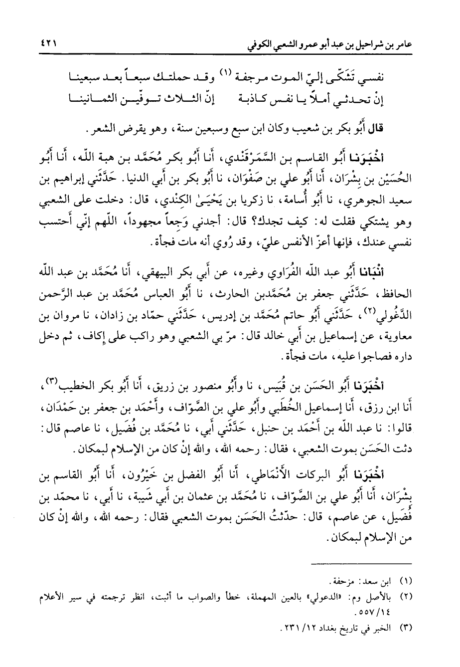 * نفسي تشتكي إلي الموت مرجفة (1) * وقد حملتك سبعا بعد سبعينا إن تحدثي أملا يا نفس كاذبة * إن الثلاث توفين الثمانينا * قال أبو بكر بن شعيب وكان ابن سبع وسبعين سنة وهو يقرض الشعر أخبرنا أبو القاسم بن السمرقندي أنا أبو بكر محمد بن هبة الله أنا أبو الحسين بن بشران أنا أبو علي بن صفوان نا أبو بكر بن أبي الدنيا حدثني إبراهيم بن سعيد الجوهري نا أبو أسامة نا زكريا بن يحيى الكندي قال دخلت على الشعبي وهو يشتكي فقلت له كيف تجدك قال أجدني وجعا مجهودا اللهم إني أحتسب نفسي عندك فإنها أعز الأنفس علي وقد روي أنه مات فجأة أنبأنا أبو عبد الله الفراوي وغيره عن أبي بكر البيهقي أنا محمد بن عبد الله الحافظ حدثني جعفر بن محمد بن الحارث نا أبو العباس محمد بن عبد الرحمن الدغولي (2) حدثني أبو حاتم محمد بن إدريس حدثني حماد بن زادان نا مروان بن معاوية عن إسماعيل بن أبي خالد قال مر بي الشعبي وهو راكب على إكاف ثم دخل داره فصاحوا عليه مات فجأة أخبرنا أبو الحسن بن القبيس نا وأبو منصور بن زريق أنا أبو بكر الخطيب (3) أنا ابن رزق أنا إسماعيل الخطبي وأبو علي بن الصواف وأحمد بن جعفر بن حمدان قالوا نا عبد الله بن أحمد بن حنبل حدثني أبي نا محمد بن فضيل نا عاصم قال دثت الحسن بموت الشعبي فقال رحمه الله والله إن كان من الإسلام لبمكان أخبرنا أبو البركات الأنماطي أنا أبو الفضل بن خيرون أنا أبو القاسم بن بشران أنا أبو علي بن الصواف نا محمد بن عثمان بن أبي شيبة نا أبي نا محمد بن فضيل عن عاصم قال حدثت الحسن بموت الشعبي فقال رحمه الله والله إن كان من الإسلام لبمكان