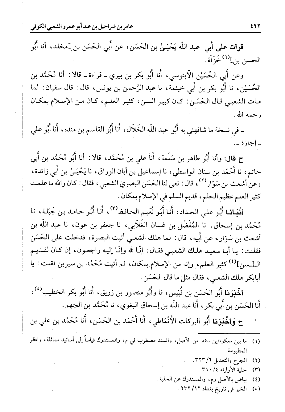 قرأت على أبي عبد الله يحيى بن الحسن عن أبي الحسن بن مخلد أنا أبو الحسن بن (1) خزفة وعن أبي الحسين الآبنوسي أنا أبو بكر بن بيري قراءة قالا أنا محمد بن الحسين نا أبو بكر بن أبي خيثمة نا عبد الرحمن بن يونس قال قال سفيان لما مات الشعبي قال الحسن كان كبير السن كثير العلم كان من الإسلام بمكان رحمة الله في نسخة ما شافهني به أبو عبد الله الخلال أنا أبو القاسم بن منده أنا أبو علي إجازة ح قال وأنا أبو طاهر بن سلمة أنا علي بن محمد قالا أنا أبو محمد بن أبي حاتم نا أحمد بن سنان الواسطي نا إسماعيل بن أبان الوراق نا يحيى بن أبي زائدة وعن أشعث بن سوار (2) قال نعى لنا الحسن البصري الشعبي فقال كان والله ما علمت كثير العلم عظيم الحلم قديم السلم في الإسلام بمكان أنبأنا أبو علي الحداد أنا أبو نعيم الحافظ (3) أنا أبو حامد بن جبلة نا محمد بن إسحاق نا المفضل بن غسان الغلابي نا جعفر بن عون نا عبد الله بن أشعث بن سوار عن أبيه قال لما هلك الشعبي أتيت البصرة فدخلت على الحسن فقلت يا أبا سعيد هلك الشعبي فقال إنا لله وإنا إليه راجعون إن كان لقديم السن (4) كثير العلم وإنه من الإسلام بمكان ثم أتيت محمد بن سيرين فقلت يا أبا بكر هلك الشعبي فقال مثل ما قال الحسن أخبرنا أبو الحسن بن قبيس نا وأبو منصور بن زريق أنا أبو بكر الخطيب (5) أنا الحسن بن أبي بكر أنا عبد الله بن إسحاق البغوي نا محمد بن الجهم ح وأخبرنا أبو البركات الأنماطي أنا أحمد بن الحسن أنا محمد بن علي بن